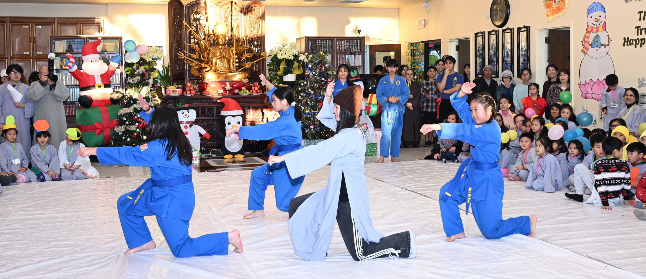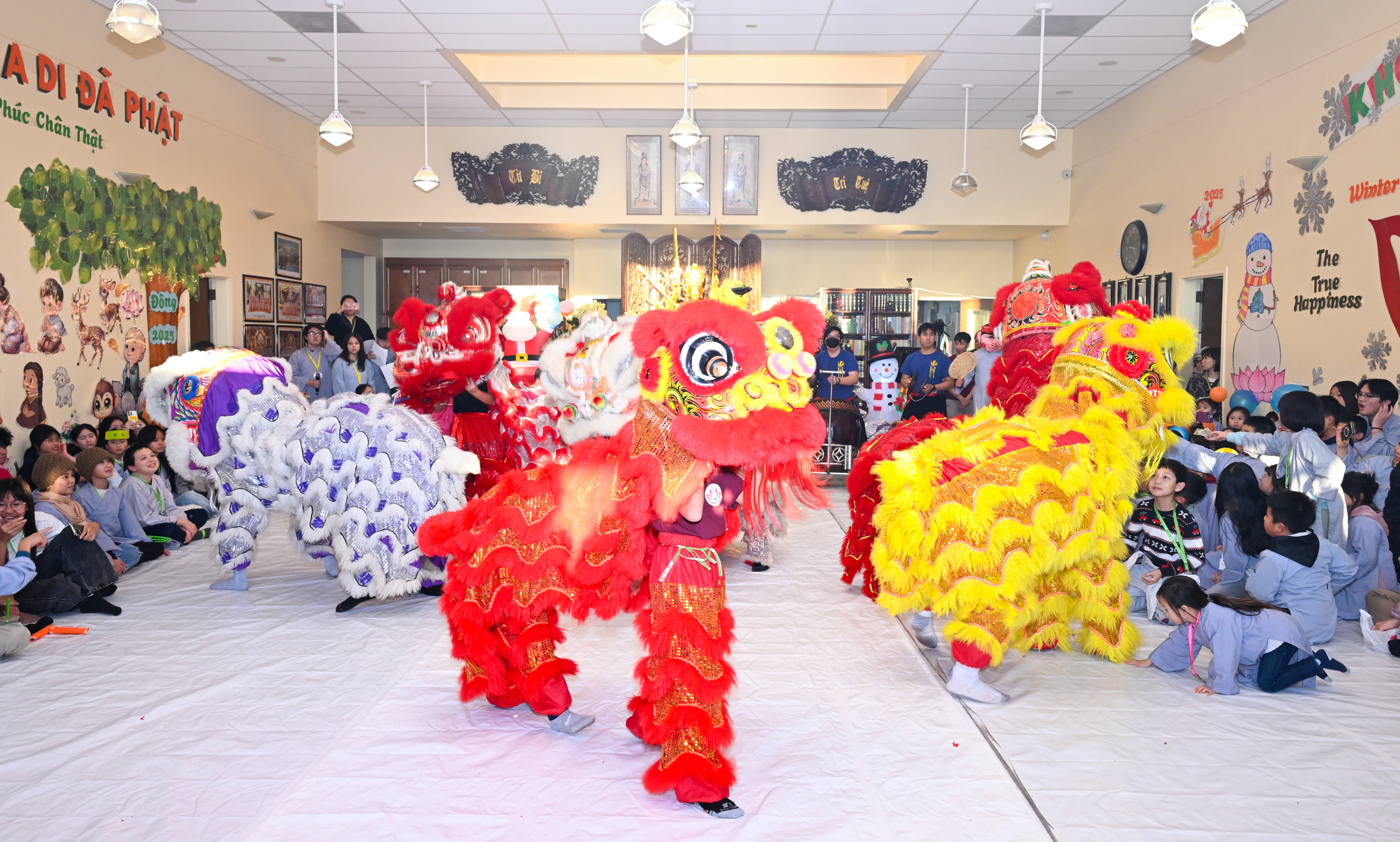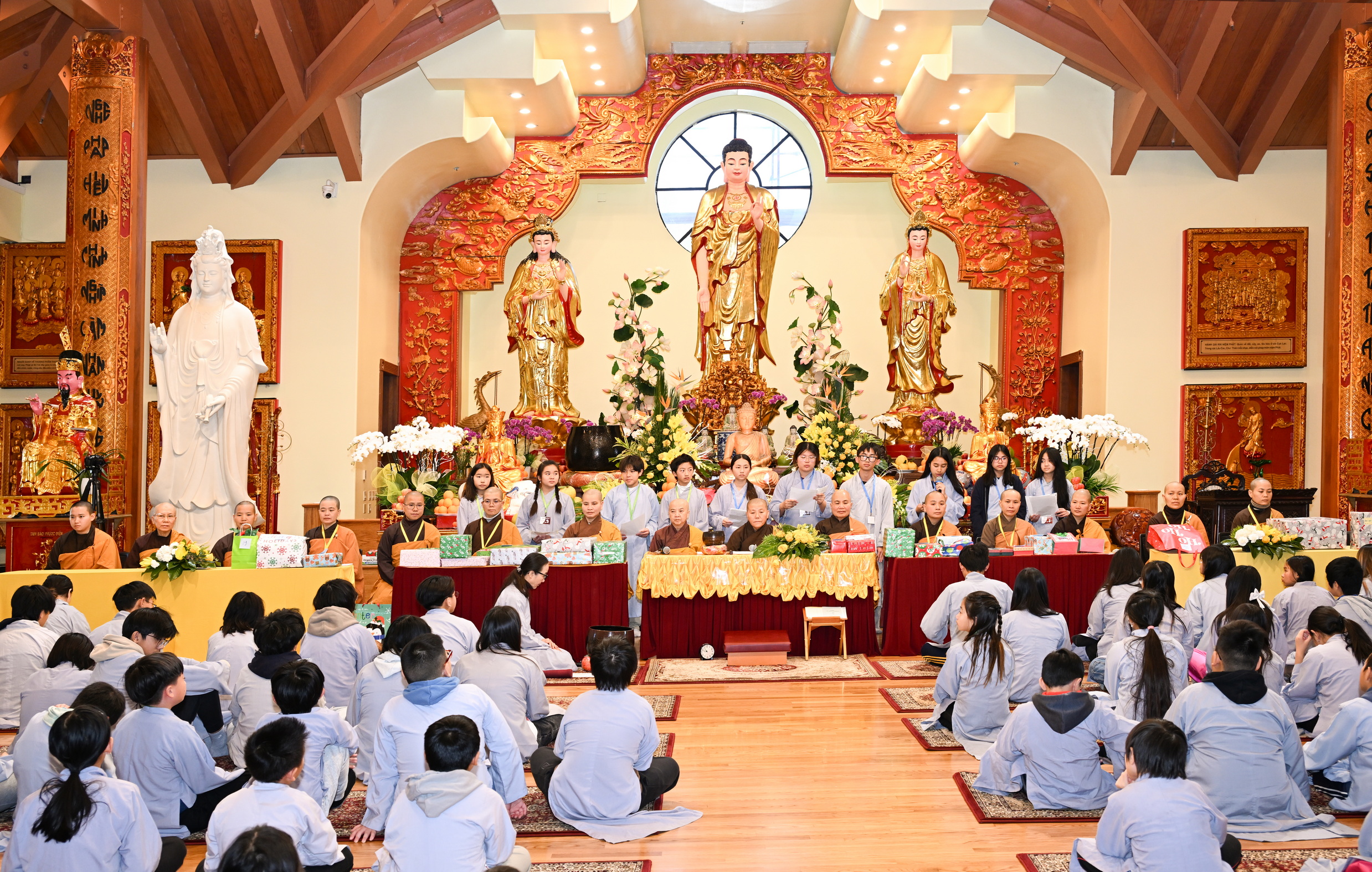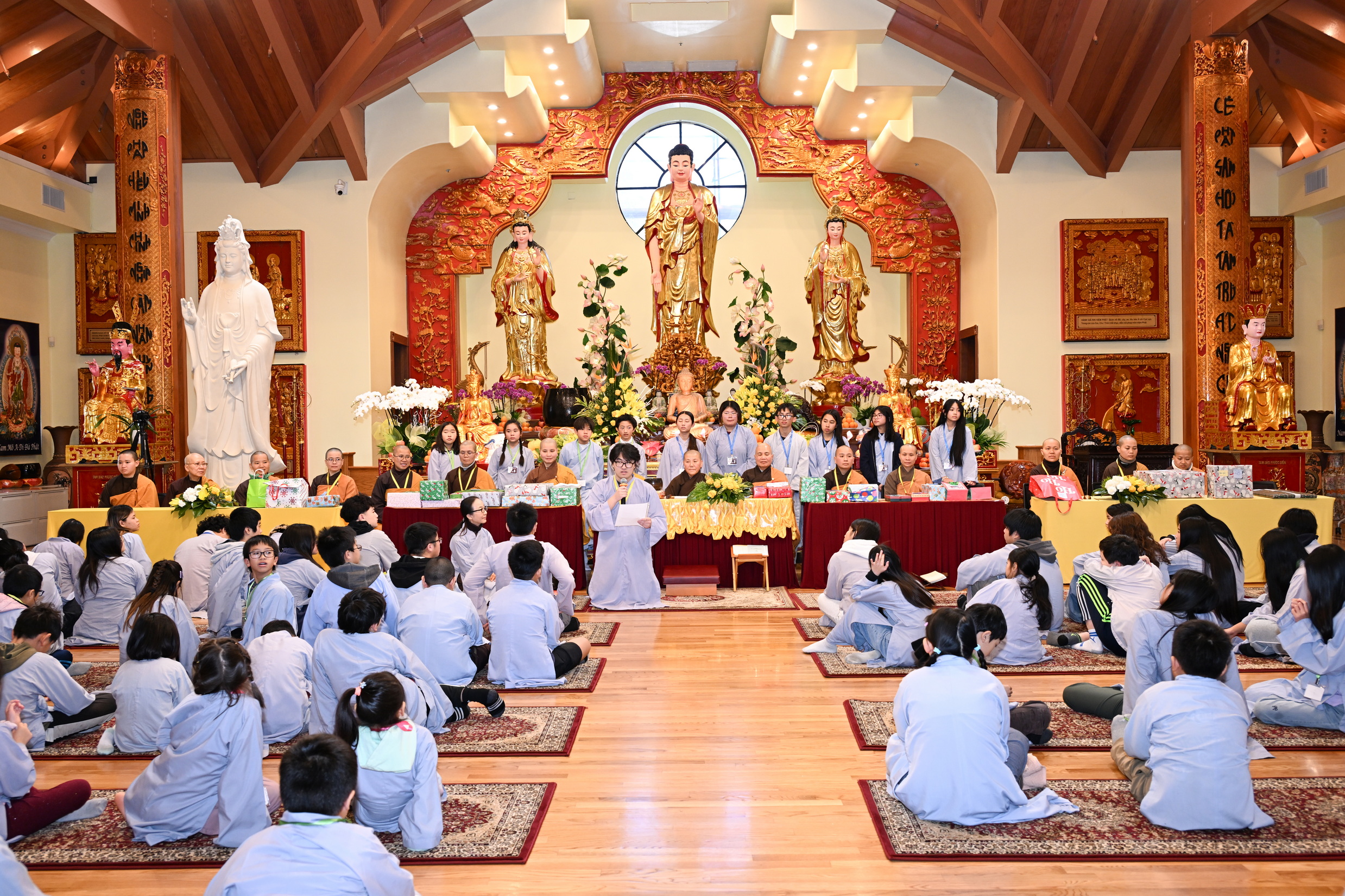 Chùa Đức Viên, San Jose, Hoa Kỳ. Khóa tu thiếu nhi mùa Đông 2025 – Ngày tu học thứ 4: 28/12/2025 Chú thích ảnh: 03-13 Sinh hoạt chung tại trai đường. Các anh chị hướng dẫn phát biểu cảm tưởng. 14-24 Sinh hoạt chung tại chánh điện. Lễ Phật, tụng kinh (tiếng Anh), lạy tứ ân. 25-37 Lễ bế mạc khóa tu tại chánh điện. Các em thiếu nhi đại diện từng nhóm phát biểu cảm tưởng (tiếng Việt, tiếng Anh) và nhận quà lưu niệm. 38-38 Lễ bế mạc khóa tu tại chánh điện. Sư cô Viên Trung Như phát biểu cảm tạ. 39-41 Lễ bế mạc khóa tu tại chánh điện. Ni sư Giám viện phát biểu. Hồi hướng. 42-42 Giờ ăn trưa 43-44 Đốt pháo 45-52 Múa lân 53-56 Biểu diễn võ thuật Vovinam 57-78 Chương trình văn nghệ của từng nhóm 79-80 Giờ ăn tối. Kết thúc khóa tu.