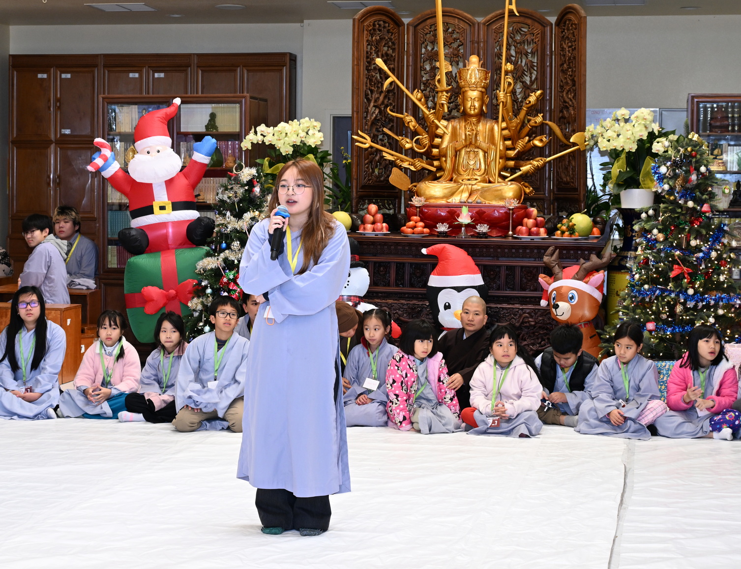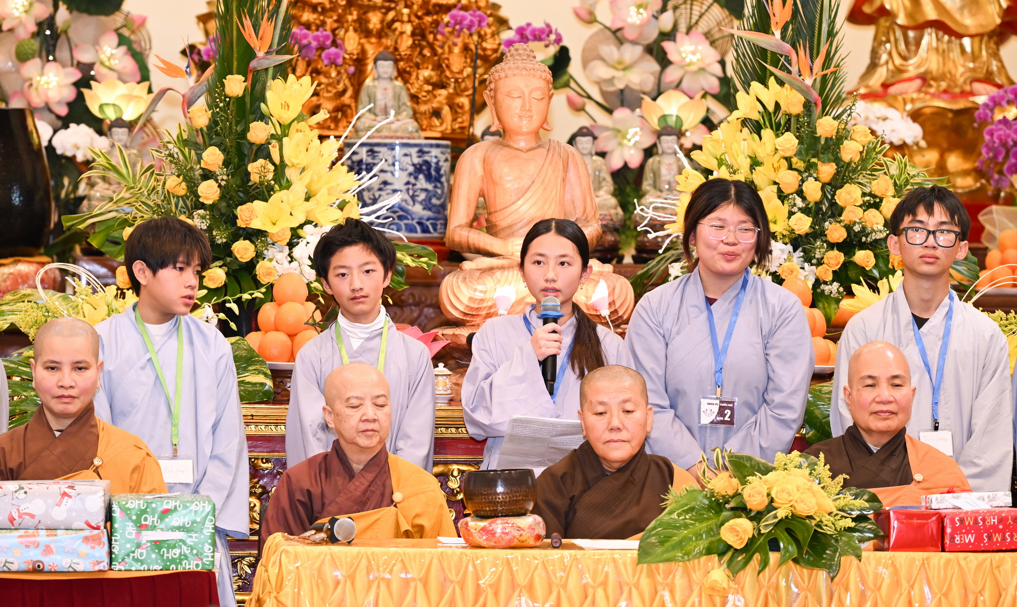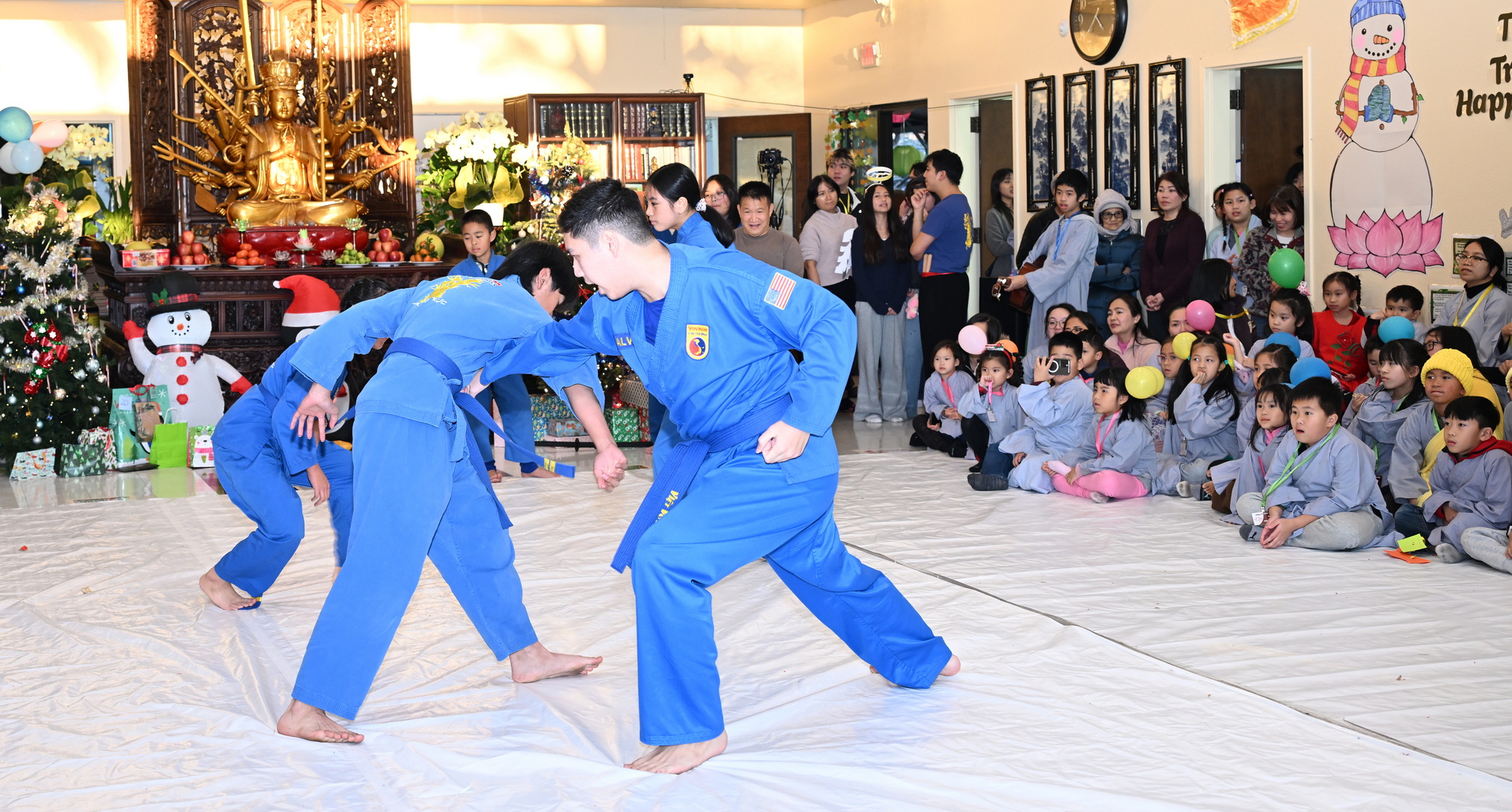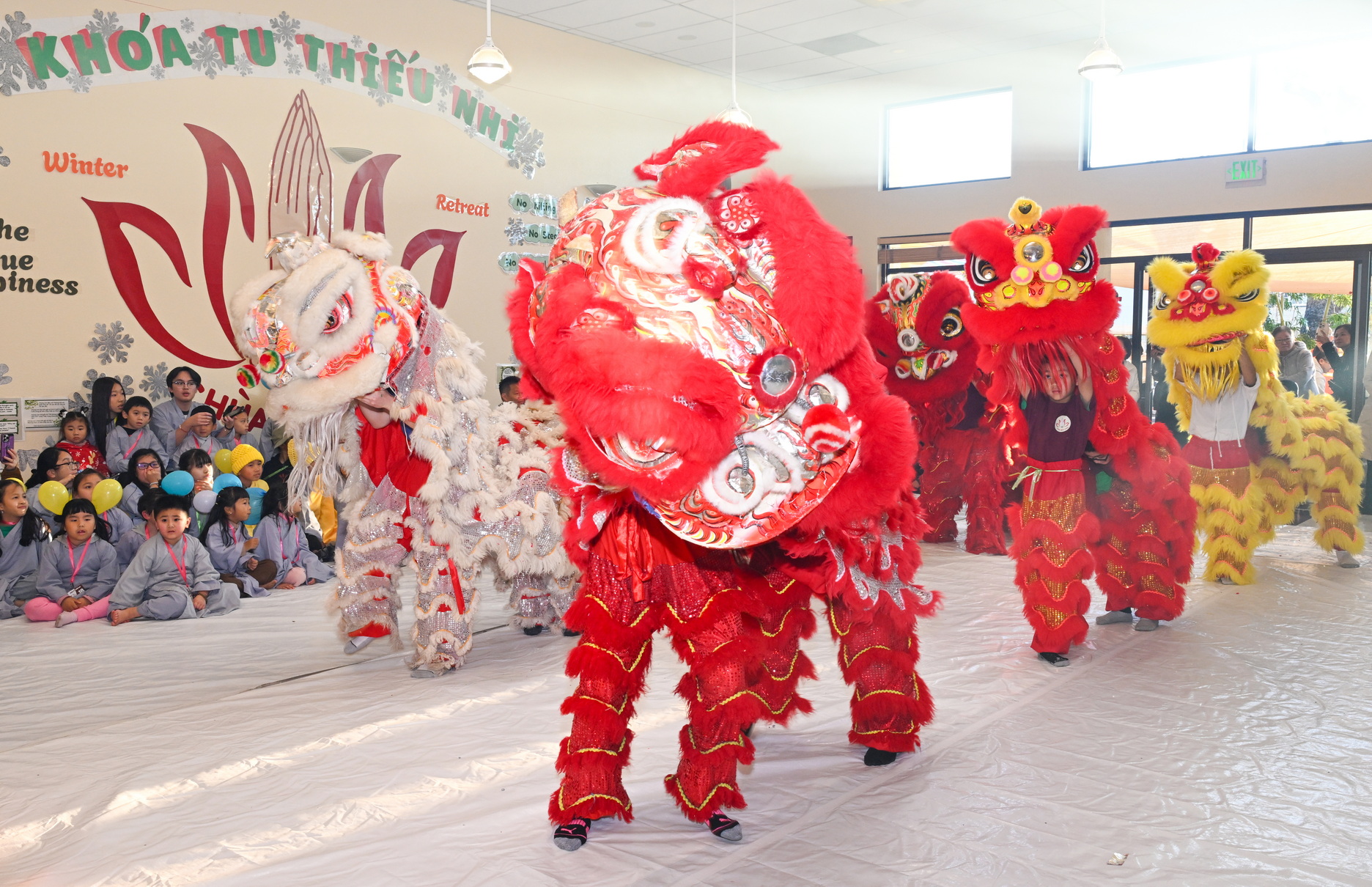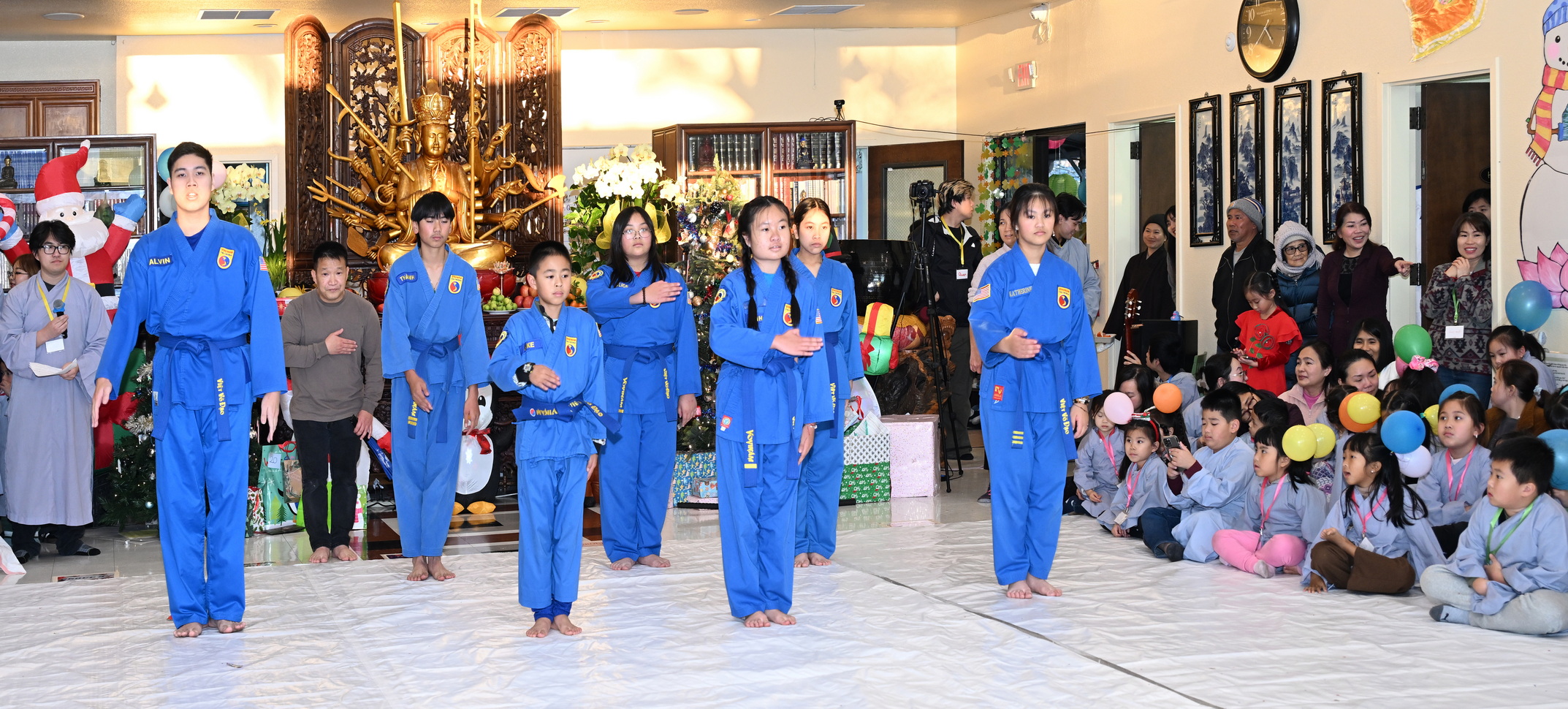 Chùa Đức Viên, San Jose, Hoa Kỳ. Khóa tu thiếu nhi mùa Đông 2025 – Ngày tu học thứ 4: 28/12/2025 Chú thích ảnh: 03-13 Sinh hoạt chung tại trai đường. Các anh chị hướng dẫn phát biểu cảm tưởng. 14-24 Sinh hoạt chung tại chánh điện. Lễ Phật, tụng kinh (tiếng Anh), lạy tứ ân. 25-37 Lễ bế mạc khóa tu tại chánh điện. Các em thiếu nhi đại diện từng nhóm phát biểu cảm tưởng (tiếng Việt, tiếng Anh) và nhận quà lưu niệm. 38-38 Lễ bế mạc khóa tu tại chánh điện. Sư cô Viên Trung Như phát biểu cảm tạ. 39-41 Lễ bế mạc khóa tu tại chánh điện. Ni sư Giám viện phát biểu. Hồi hướng. 42-42 Giờ ăn trưa 43-44 Đốt pháo 45-52 Múa lân 53-56 Biểu diễn võ thuật Vovinam 57-78 Chương trình văn nghệ của từng nhóm 79-80 Giờ ăn tối. Kết thúc khóa tu.