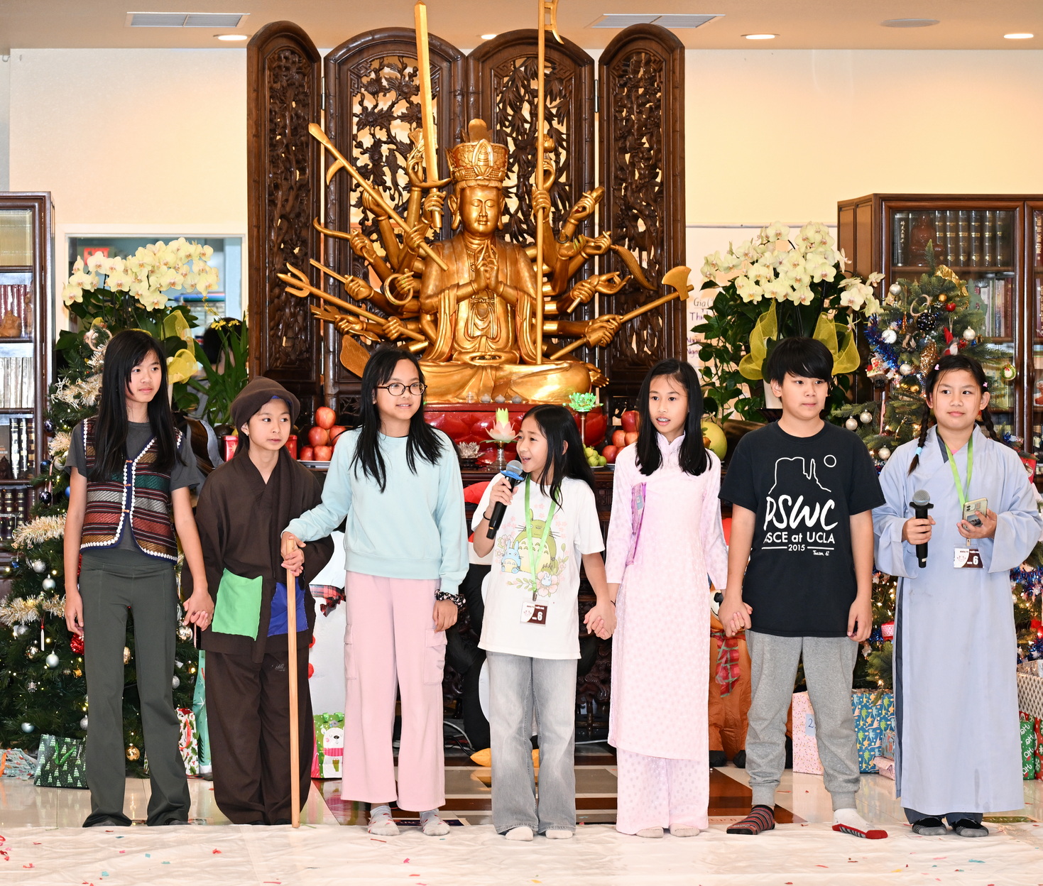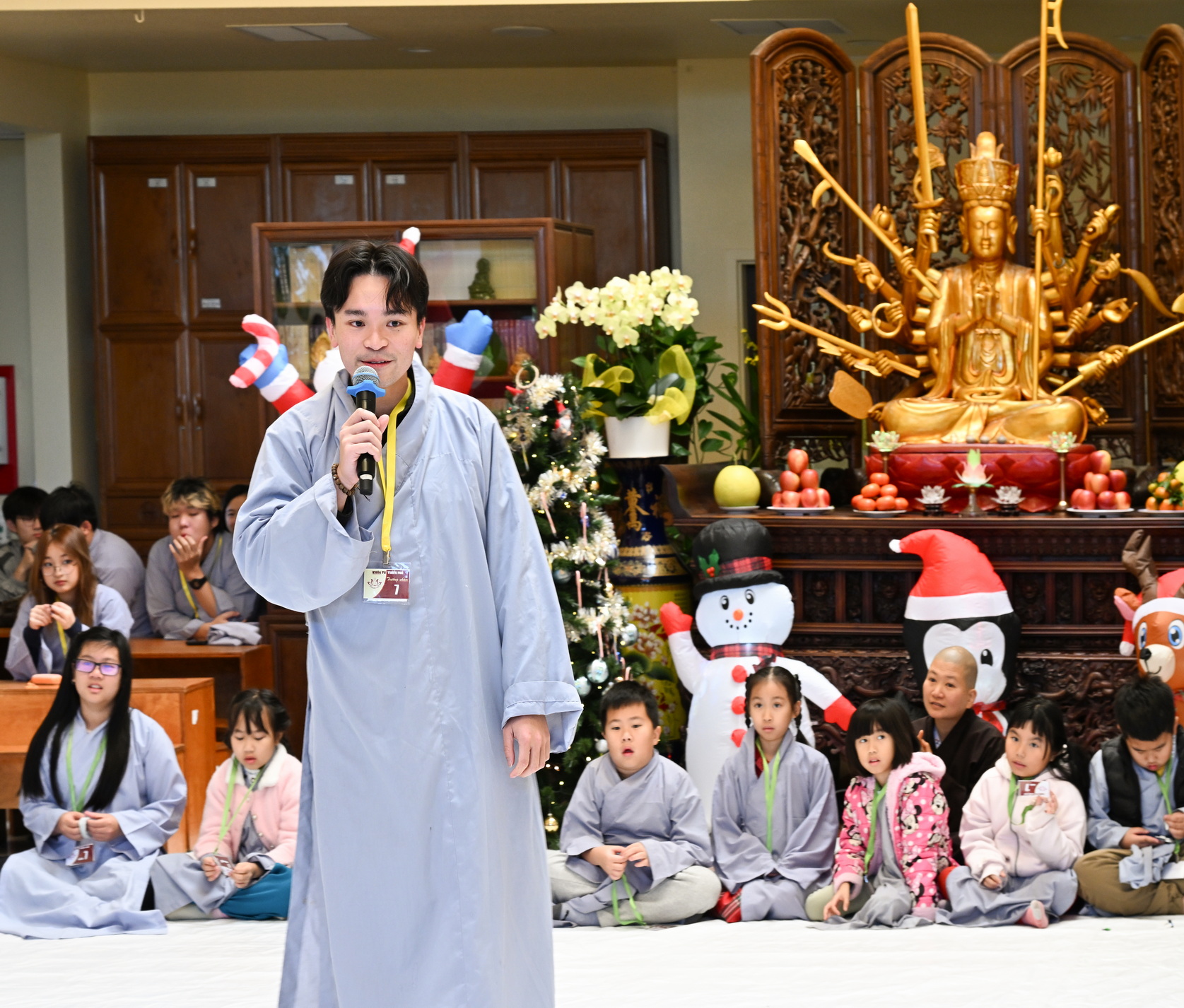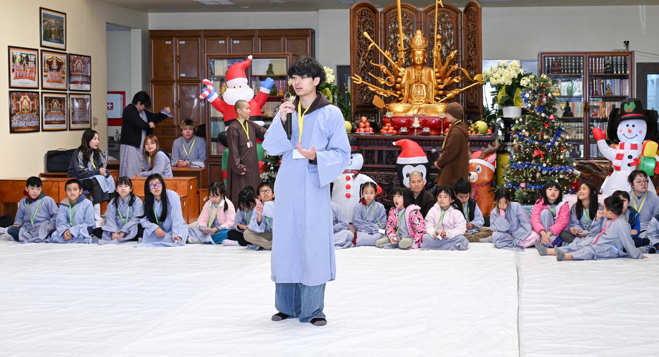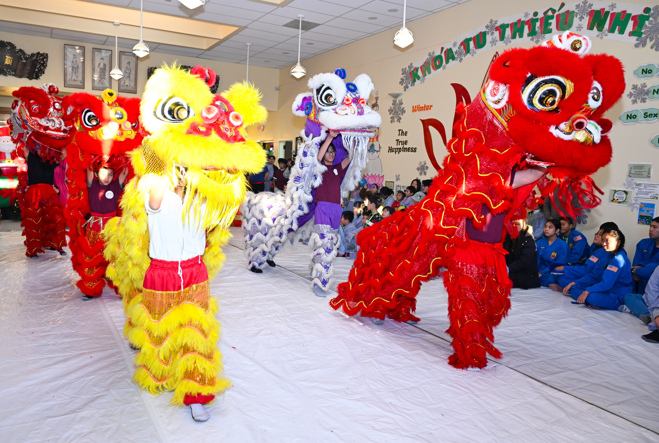 Chùa Đức Viên, San Jose, Hoa Kỳ. Khóa tu thiếu nhi mùa Đông 2025 – Ngày tu học thứ 4: 28/12/2025 Chú thích ảnh: 03-13 Sinh hoạt chung tại trai đường. Các anh chị hướng dẫn phát biểu cảm tưởng. 14-24 Sinh hoạt chung tại chánh điện. Lễ Phật, tụng kinh (tiếng Anh), lạy tứ ân. 25-37 Lễ bế mạc khóa tu tại chánh điện. Các em thiếu nhi đại diện từng nhóm phát biểu cảm tưởng (tiếng Việt, tiếng Anh) và nhận quà lưu niệm. 38-38 Lễ bế mạc khóa tu tại chánh điện. Sư cô Viên Trung Như phát biểu cảm tạ. 39-41 Lễ bế mạc khóa tu tại chánh điện. Ni sư Giám viện phát biểu. Hồi hướng. 42-42 Giờ ăn trưa 43-44 Đốt pháo 45-52 Múa lân 53-56 Biểu diễn võ thuật Vovinam 57-78 Chương trình văn nghệ của từng nhóm 79-80 Giờ ăn tối. Kết thúc khóa tu.