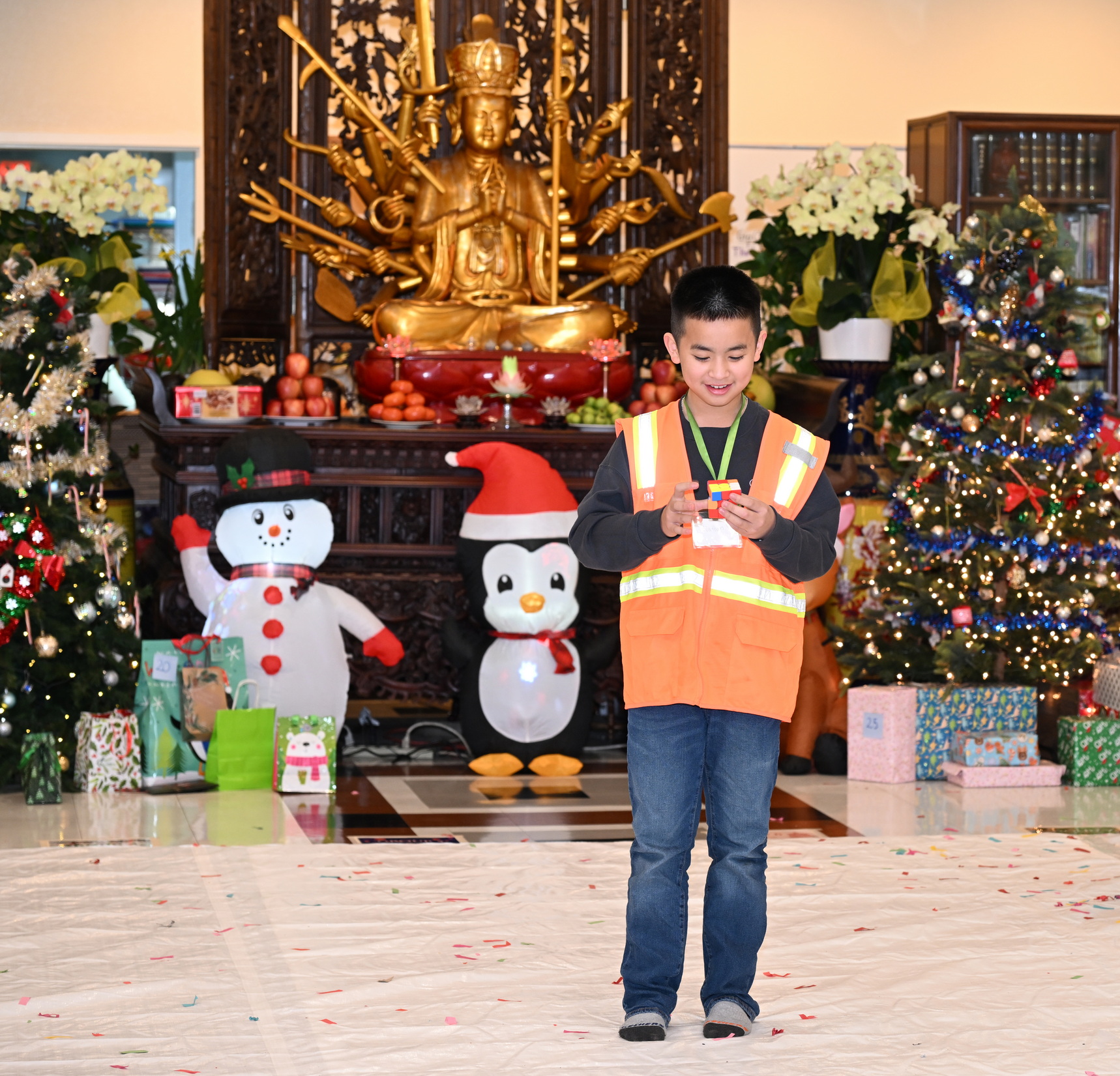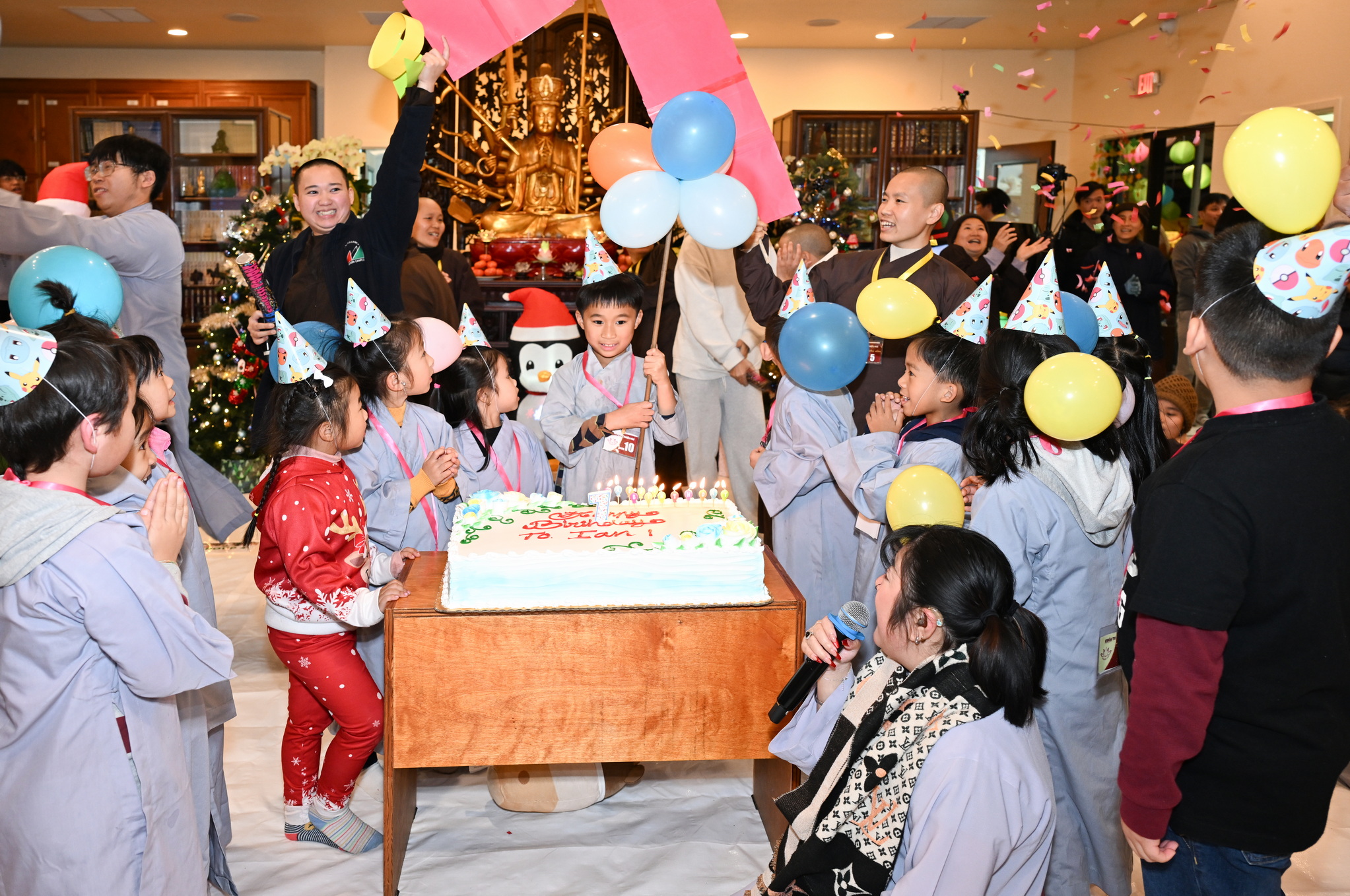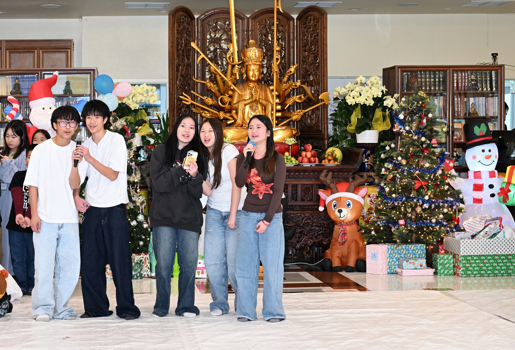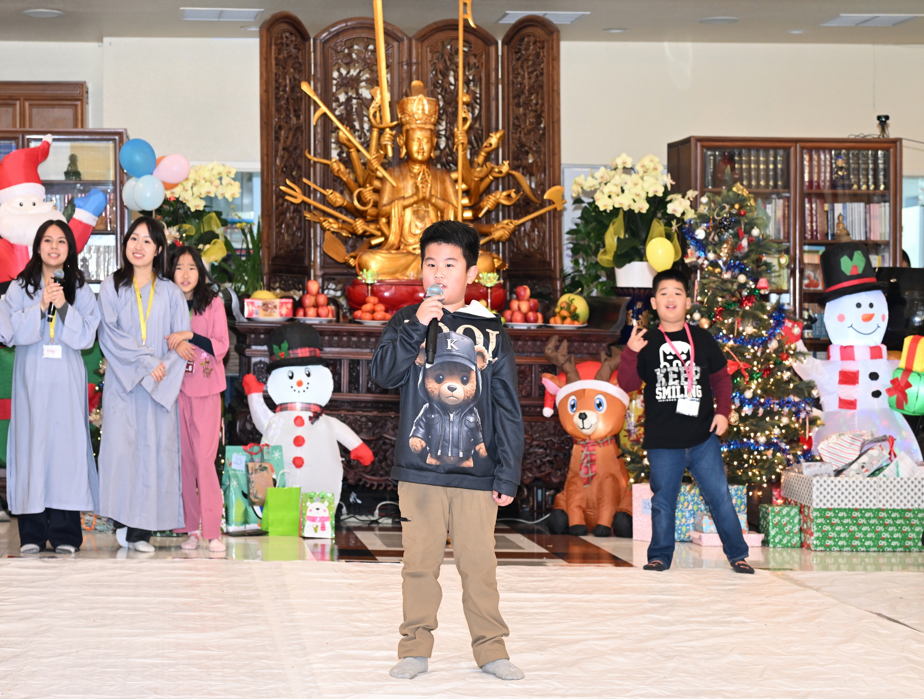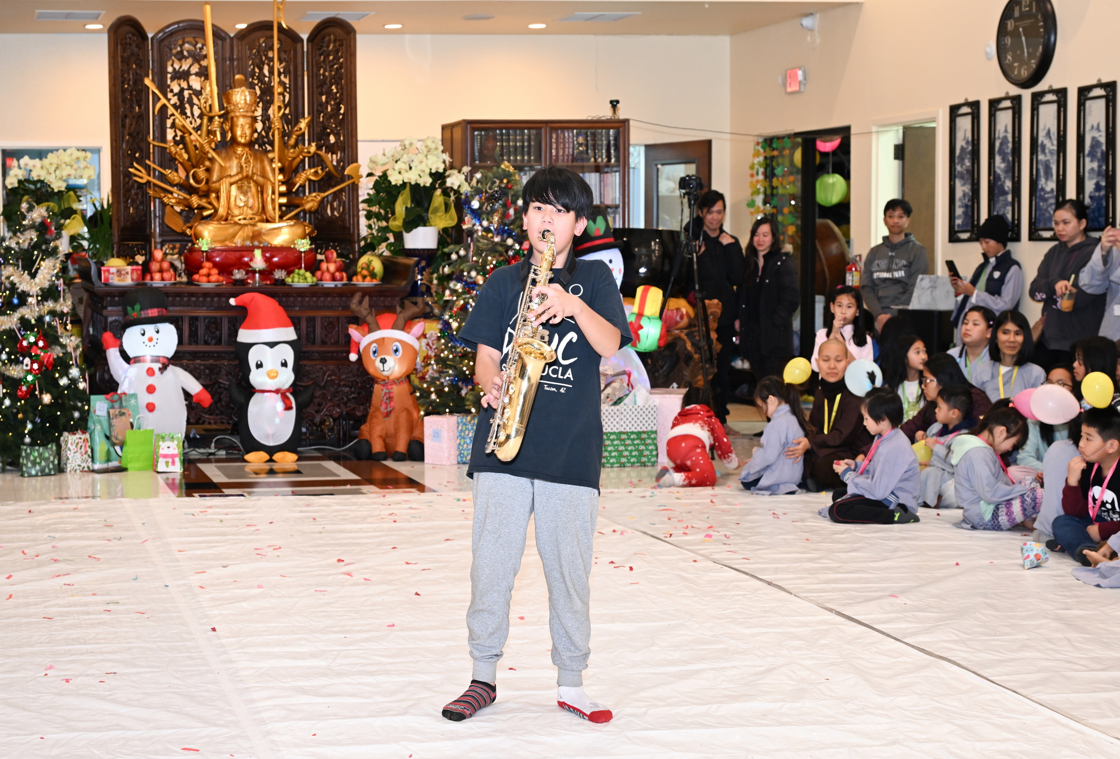 Chùa Đức Viên, San Jose, Hoa Kỳ. Khóa tu thiếu nhi mùa Đông 2025 – Ngày tu học thứ 4: 28/12/2025 Chú thích ảnh: 03-13 Sinh hoạt chung tại trai đường. Các anh chị hướng dẫn phát biểu cảm tưởng. 14-24 Sinh hoạt chung tại chánh điện. Lễ Phật, tụng kinh (tiếng Anh), lạy tứ ân. 25-37 Lễ bế mạc khóa tu tại chánh điện. Các em thiếu nhi đại diện từng nhóm phát biểu cảm tưởng (tiếng Việt, tiếng Anh) và nhận quà lưu niệm. 38-38 Lễ bế mạc khóa tu tại chánh điện. Sư cô Viên Trung Như phát biểu cảm tạ. 39-41 Lễ bế mạc khóa tu tại chánh điện. Ni sư Giám viện phát biểu. Hồi hướng. 42-42 Giờ ăn trưa 43-44 Đốt pháo 45-52 Múa lân 53-56 Biểu diễn võ thuật Vovinam 57-78 Chương trình văn nghệ của từng nhóm 79-80 Giờ ăn tối. Kết thúc khóa tu.