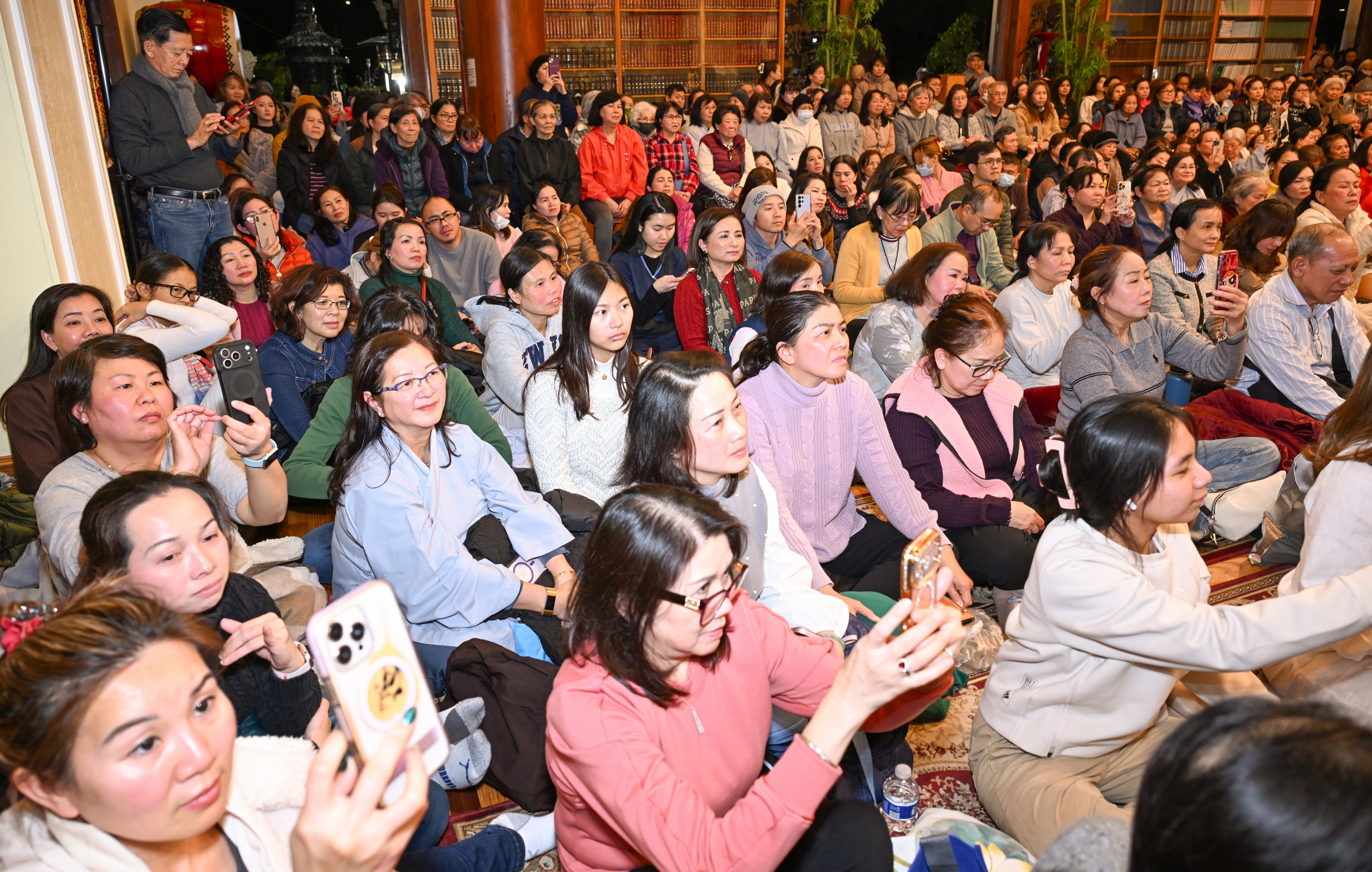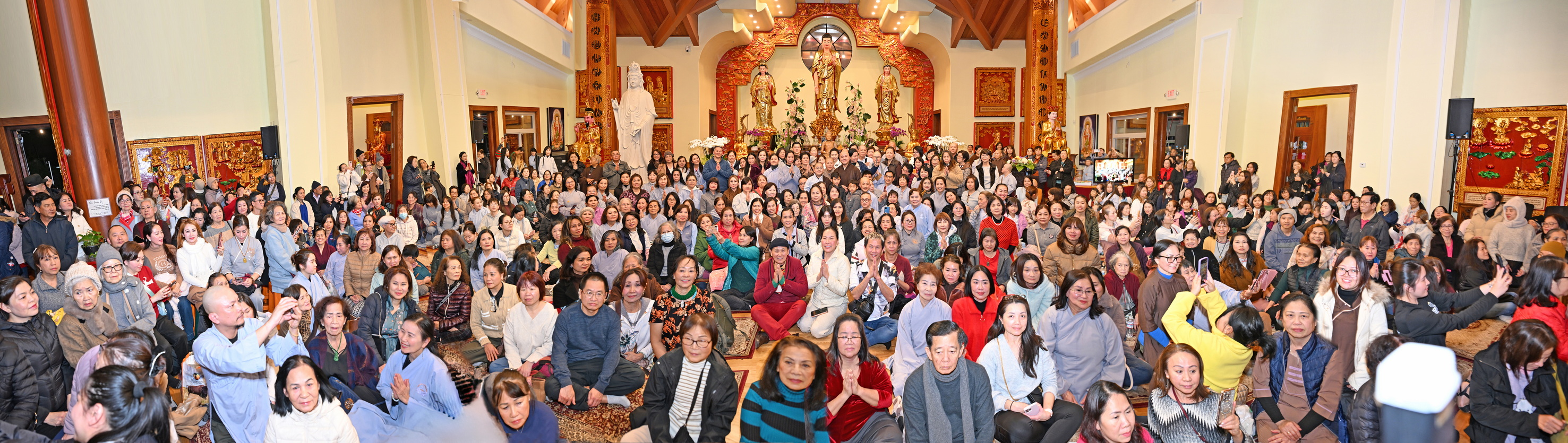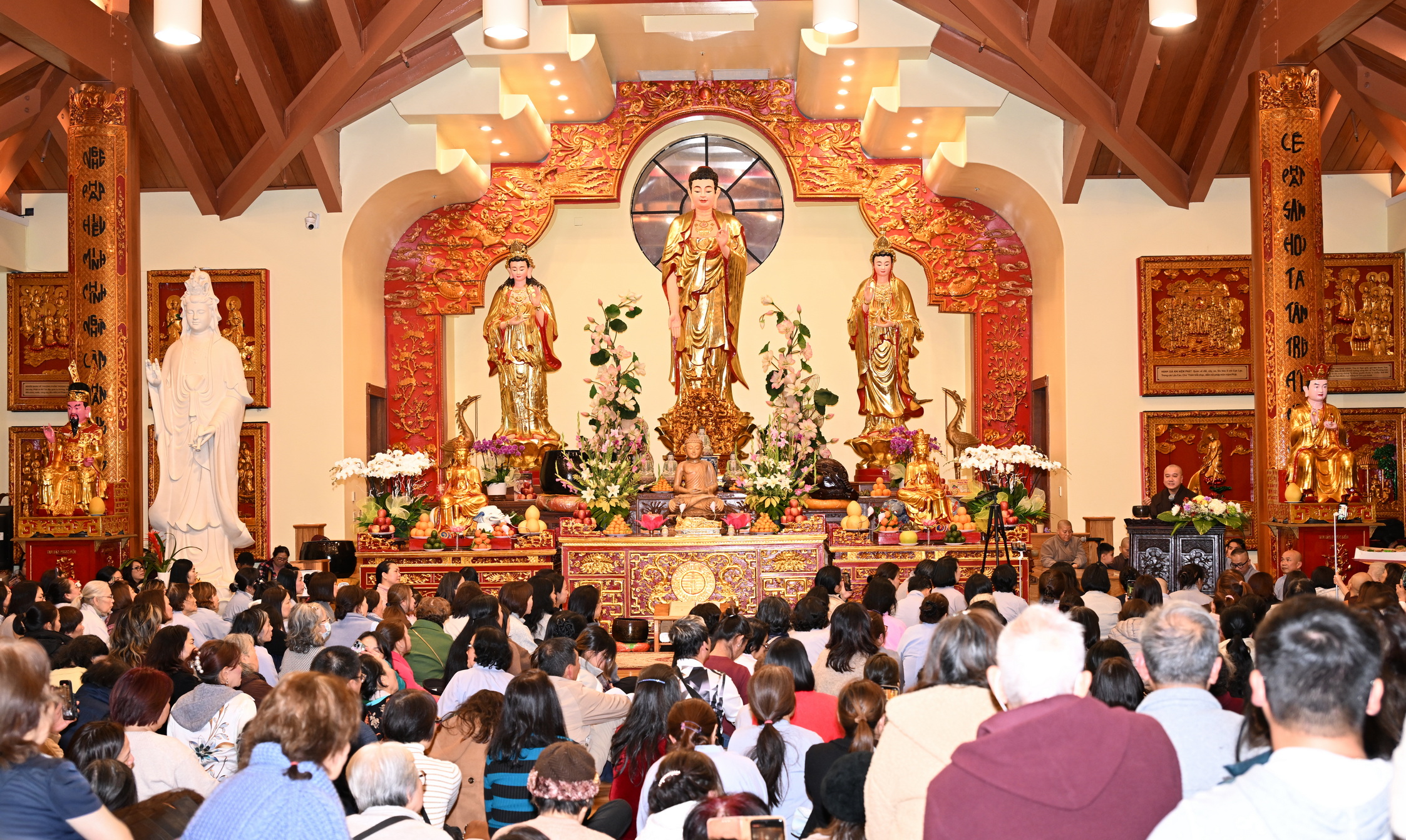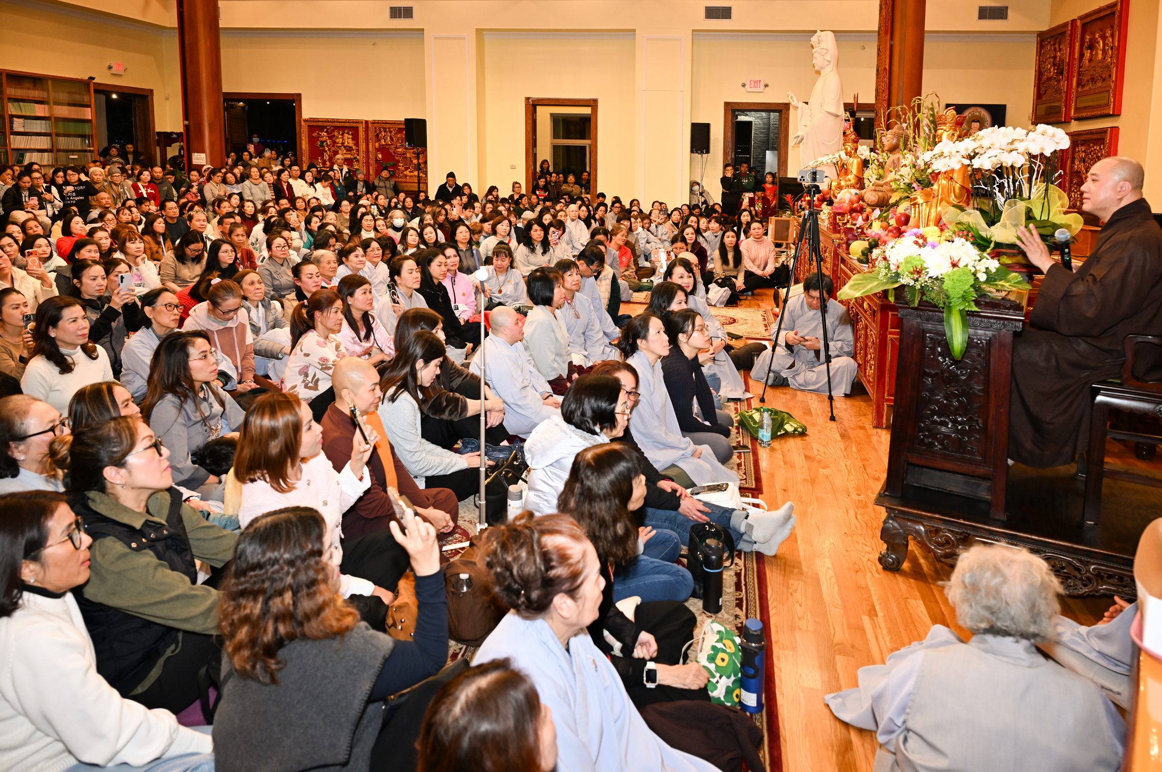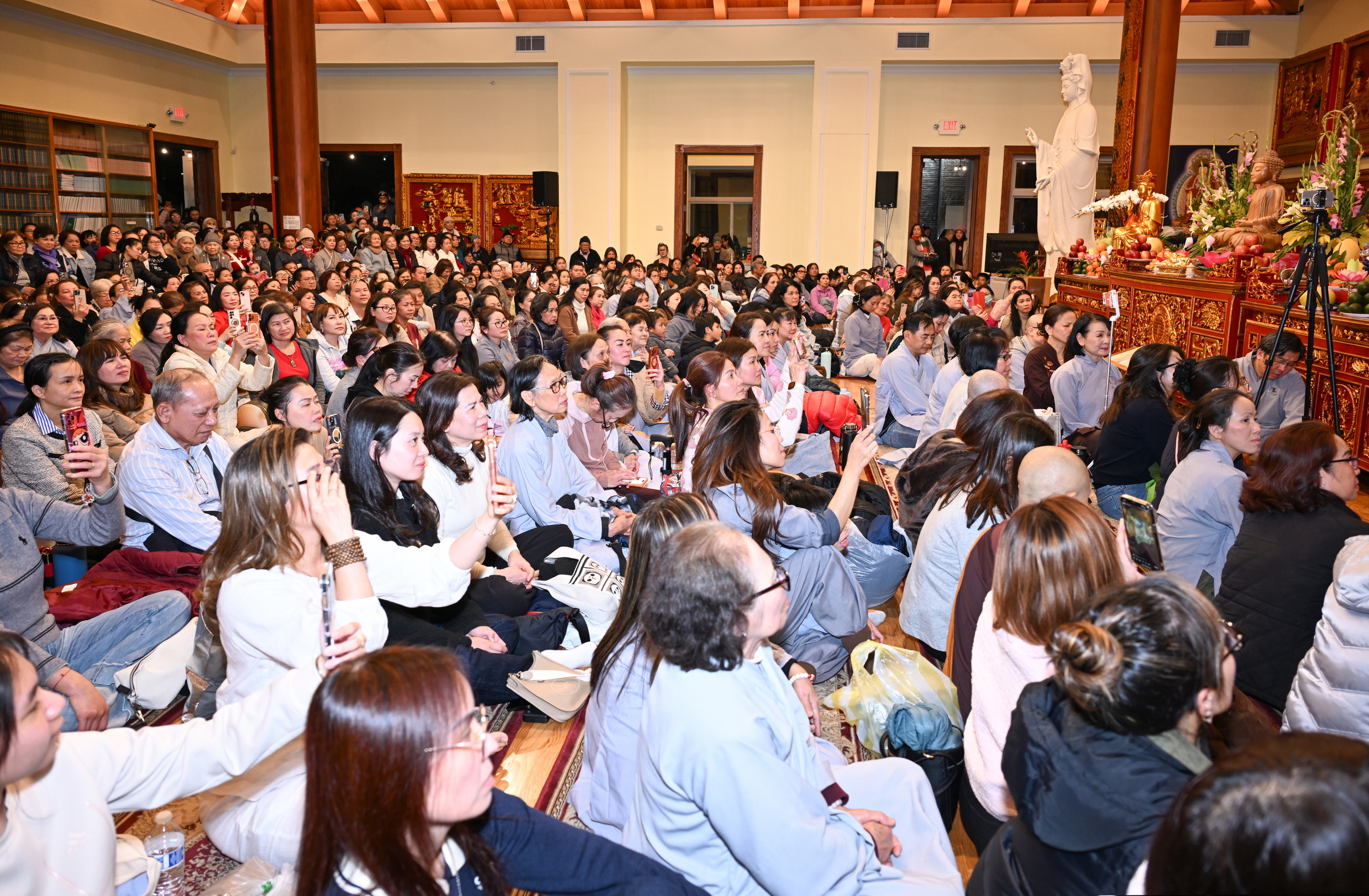 Số lượng thính chúng gần cả ngàn người, ngồi chật kín trong chánh điện, sân trước, hành lang, sân sau, vườn chùa … Nhiều Phật tử cao niên đã đến chùa từ trưa; vất vả tìm chỗ đậu xe (parking) khá xa chùa để vào được bên trong chánh điện.