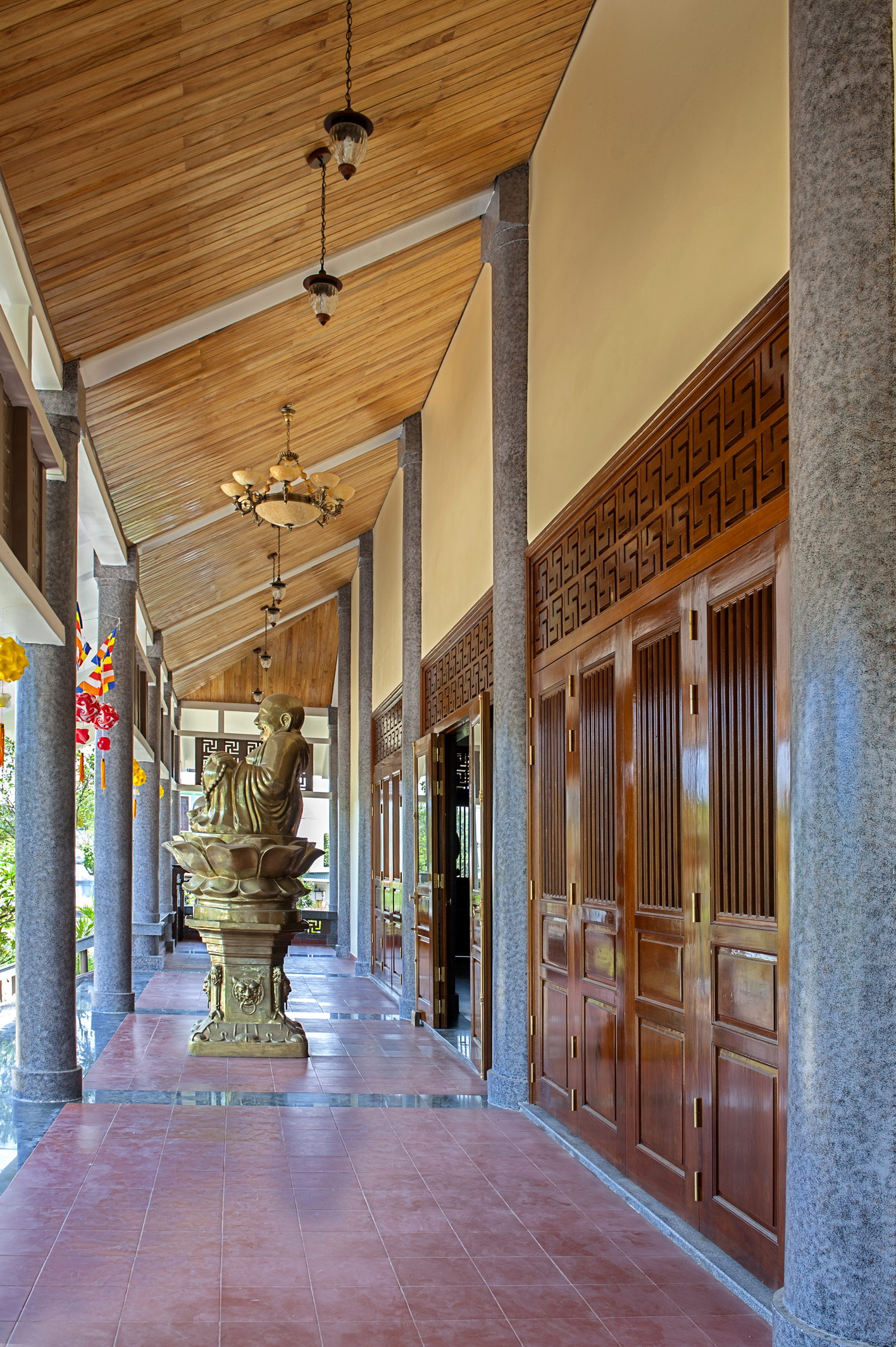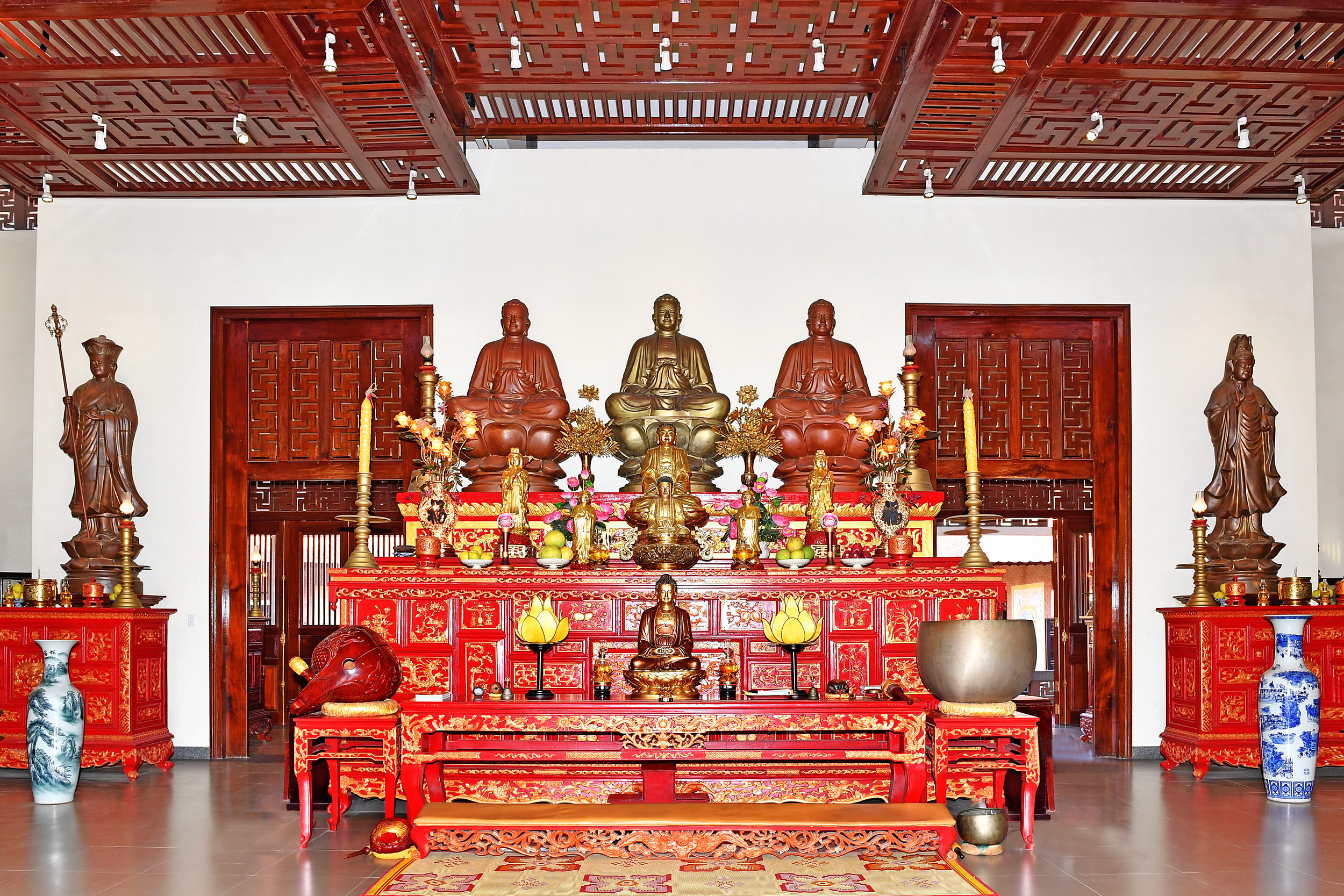 Ngôi chánh điện uy nghi với ba tầng mái, mang nét kiến trúc Á Đông, trang nghiêm, thanh thoát. Điện Phật được bài trí tôn nghiêm, rực rỡ. Hương án giữa thờ bộ tượng Tam Thế Phật bằng đồng uy nghi tọa thiền trên đài sen. Các bậc thấp hơn phía trước, tôn trí tượng đức Phật A Di Đà, đức Phật Thích Ca; Bồ tát Văn Thù, Bồ tát Phổ Hiền; tượng Tôn giả Ca Diếp và Tôn giả A Nan. Án thờ hai bên tôn trí tượng Bồ tát Quán Thế Âm và Bồ tát Địa Tạng. Hai bên lầu chuông trống có án thờ Hộ Pháp và án thờ Tiêu Diện. Tiền đường đặt tôn tượng Di Lặc. Phía sau điện Phật là gian hậu tổ, tôn trí di ảnh và long vị chư Tổ. Sân trước và sân giữa chùa có tượng Bồ tát Quán Thế Âm lộ thiên bằng đá cẩm thạch.