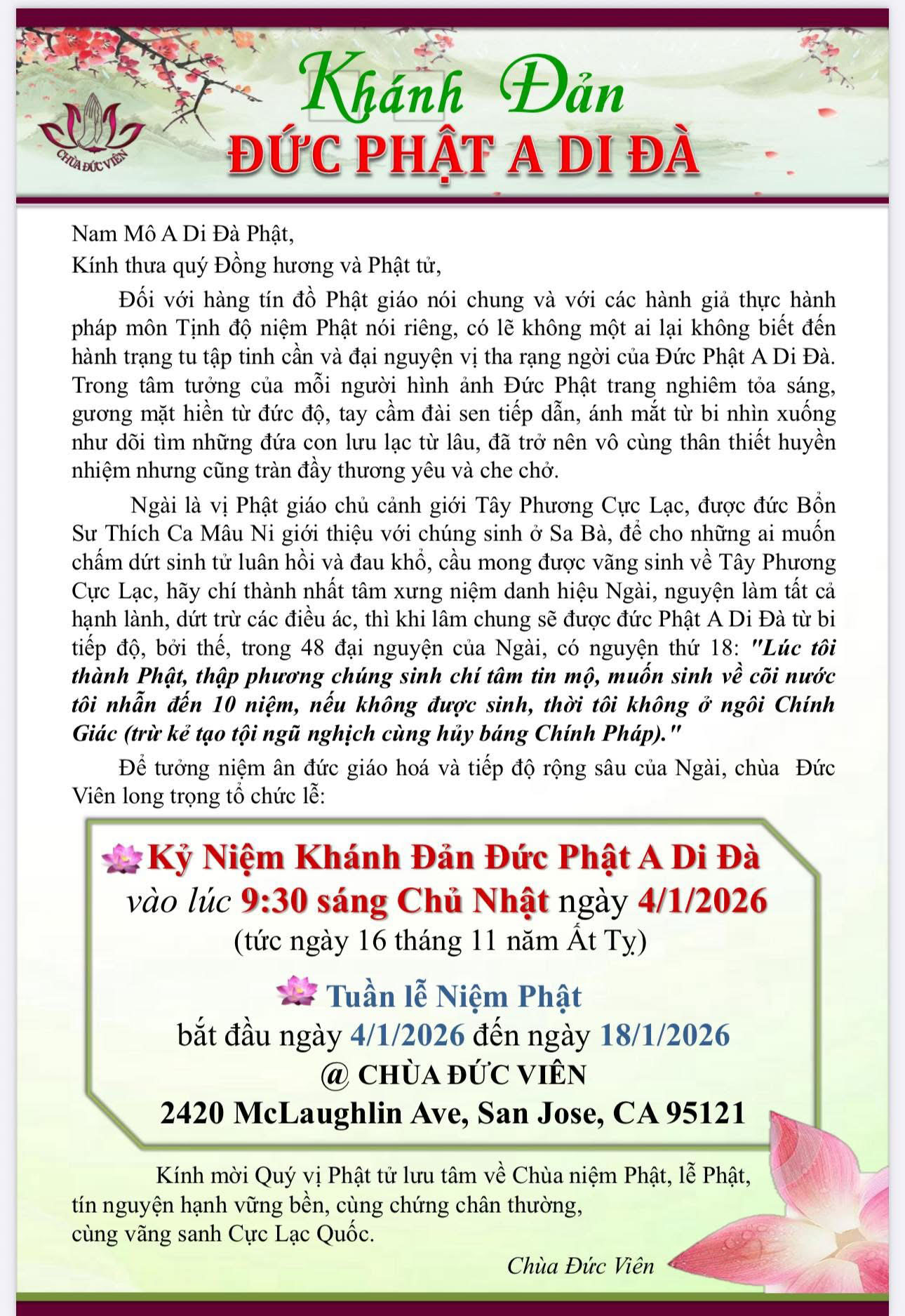 Vào lúc 09g30 sáng chủ nhật 04 tháng 01 năm 2026, chùa Đức Viên tọa lạc tại số 2420 McLaughlin Avenue, thành phố San Jose, tiểu bang California đã trang nghiêm tổ chức Lễ Khánh đản Đức Phật A Di Đà, vị Phật Giáo chủ cảnh giới Tây Phương Cực Lạc. Nội dung buổi lễ như sau: Thỉnh 3 hồi chuông trống bát nhã. Ni sư Giám viện Thích Đàm Nhật dâng lời phát nguyện khai mạc khóa tu niệm Phật 2 tuần, từ ngày 04/01/2026 đến ngày 18/01/2026. Tụng kinh Lăng Nghiêm - Chương niệm Phật của Bồ tát Đại Thế Chí. Nghe khai thị. Lễ Ký Số. Hồi hướng. Phục nguyện. Tự quy. Giảng pháp. Buổi lễ kết thúc vào lúc 12g trưa. Đại chúng thật hỷ lạc! Nam mô Pháp Giới Tạng Thân A Di Đà Phật. Võ Văn Tường