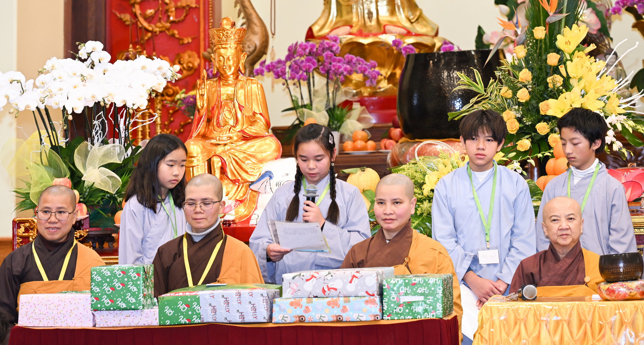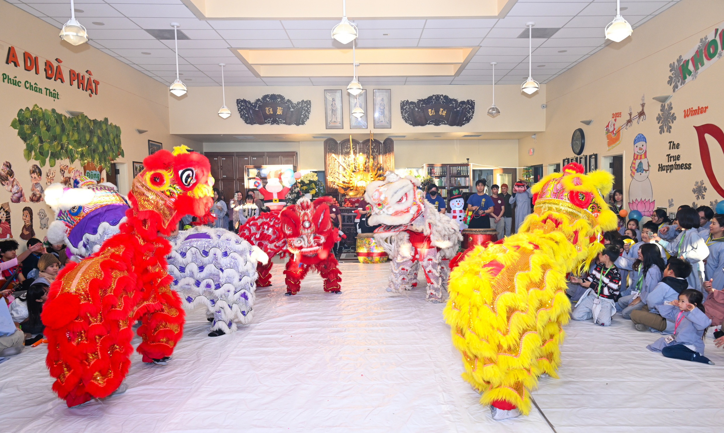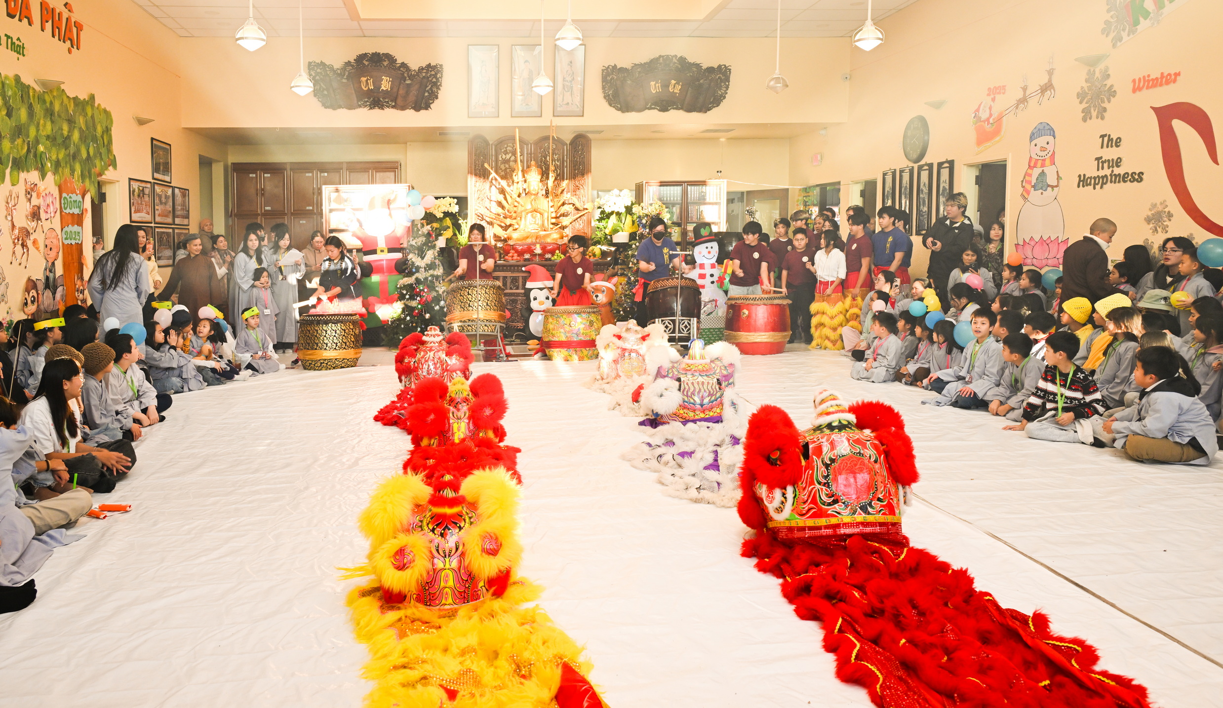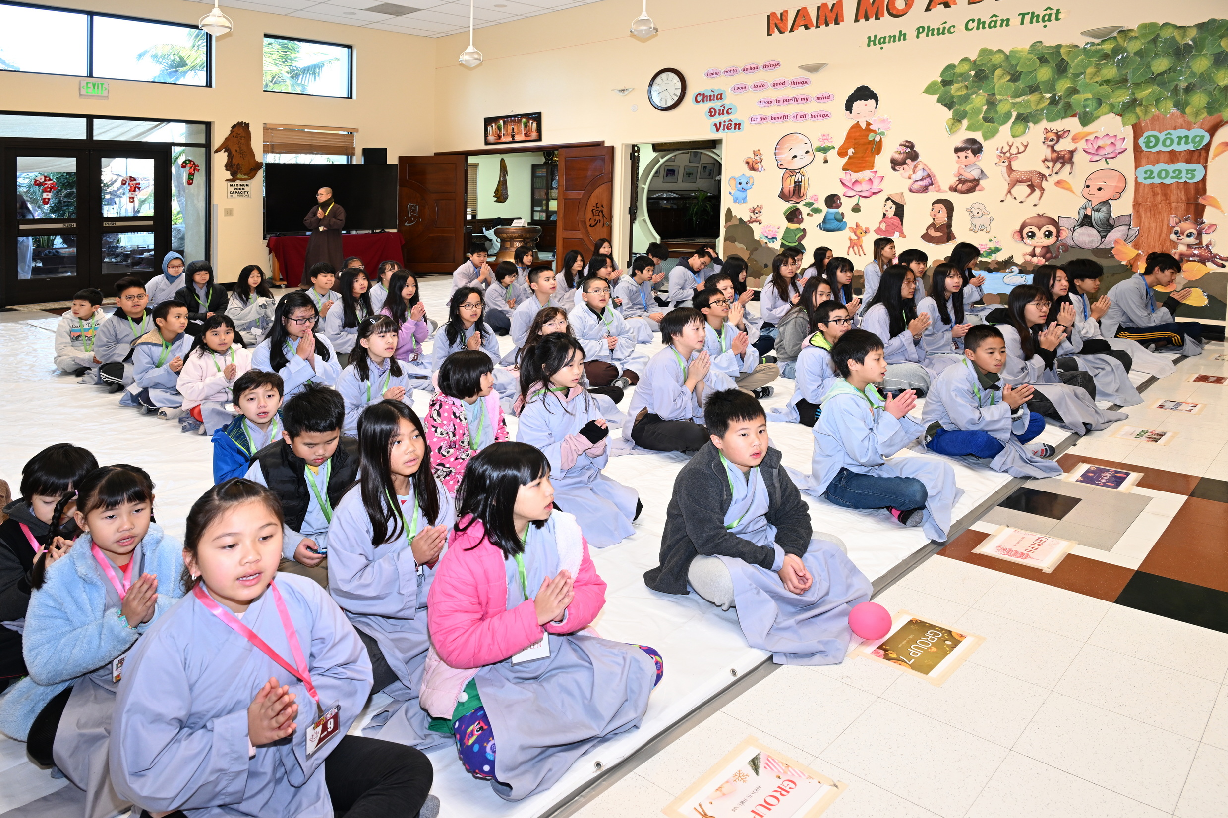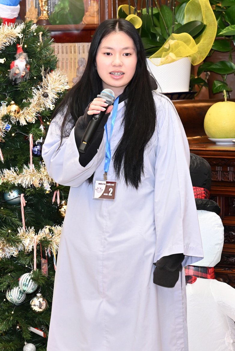 Chùa Đức Viên, San Jose, Hoa Kỳ. Khóa tu thiếu nhi mùa Đông 2025 – Ngày tu học thứ 4: 28/12/2025 Chú thích ảnh: 03-13 Sinh hoạt chung tại trai đường. Các anh chị hướng dẫn phát biểu cảm tưởng. 14-24 Sinh hoạt chung tại chánh điện. Lễ Phật, tụng kinh (tiếng Anh), lạy tứ ân. 25-37 Lễ bế mạc khóa tu tại chánh điện. Các em thiếu nhi đại diện từng nhóm phát biểu cảm tưởng (tiếng Việt, tiếng Anh) và nhận quà lưu niệm. 38-38 Lễ bế mạc khóa tu tại chánh điện. Sư cô Viên Trung Như phát biểu cảm tạ. 39-41 Lễ bế mạc khóa tu tại chánh điện. Ni sư Giám viện phát biểu. Hồi hướng. 42-42 Giờ ăn trưa 43-44 Đốt pháo 45-52 Múa lân 53-56 Biểu diễn võ thuật Vovinam 57-78 Chương trình văn nghệ của từng nhóm 79-80 Giờ ăn tối. Kết thúc khóa tu.