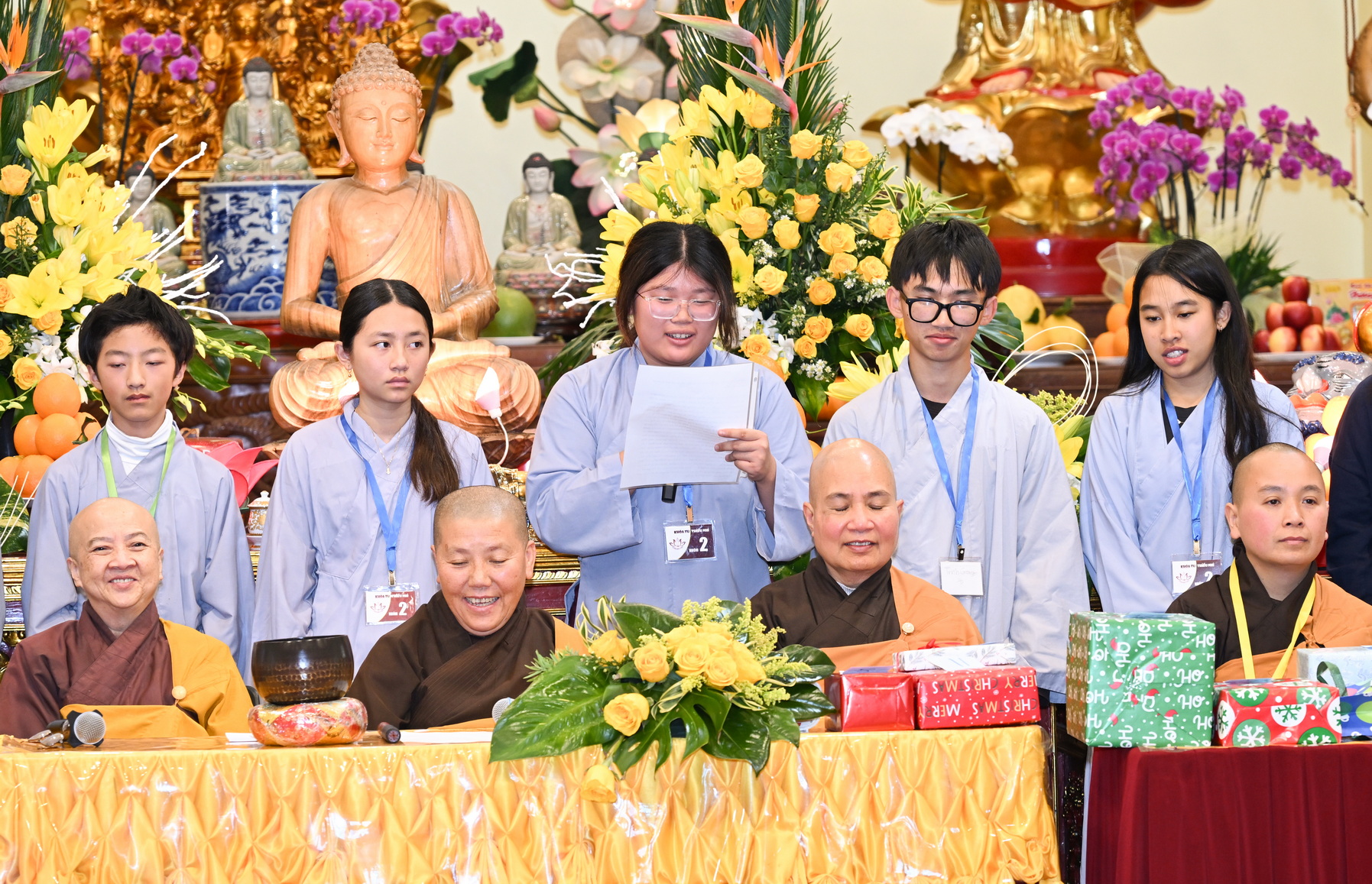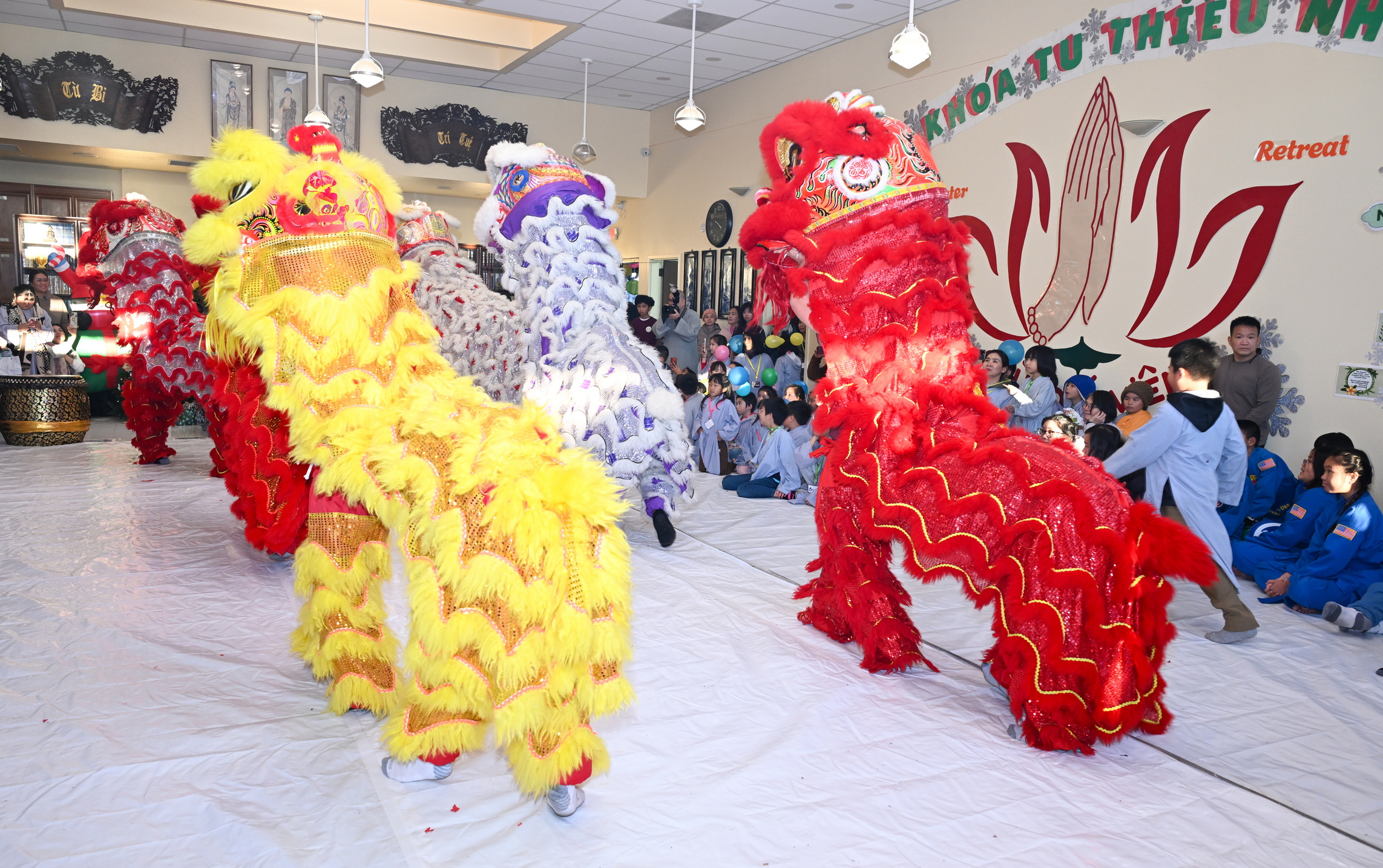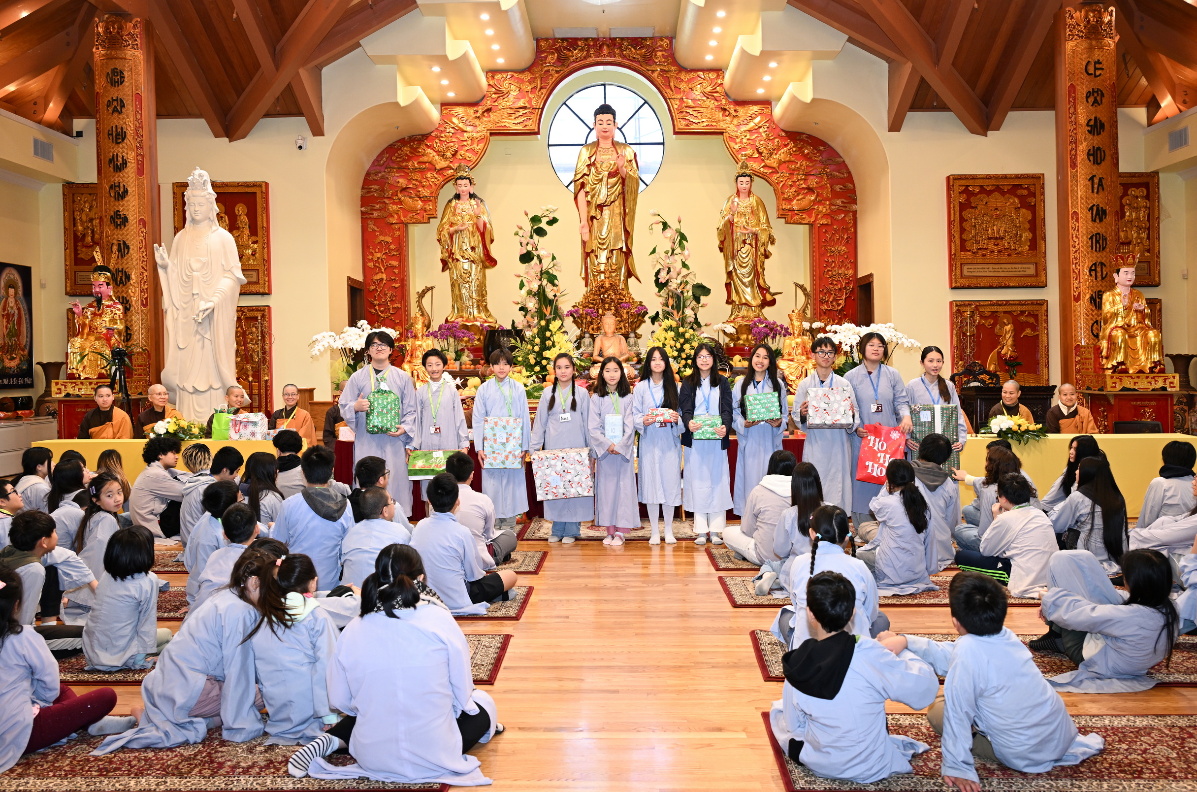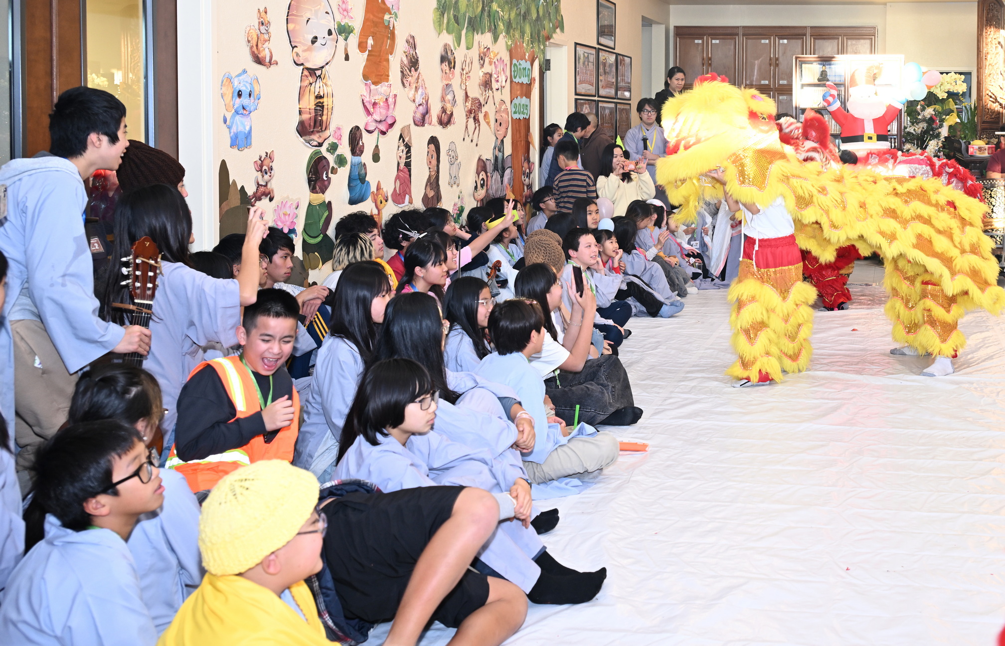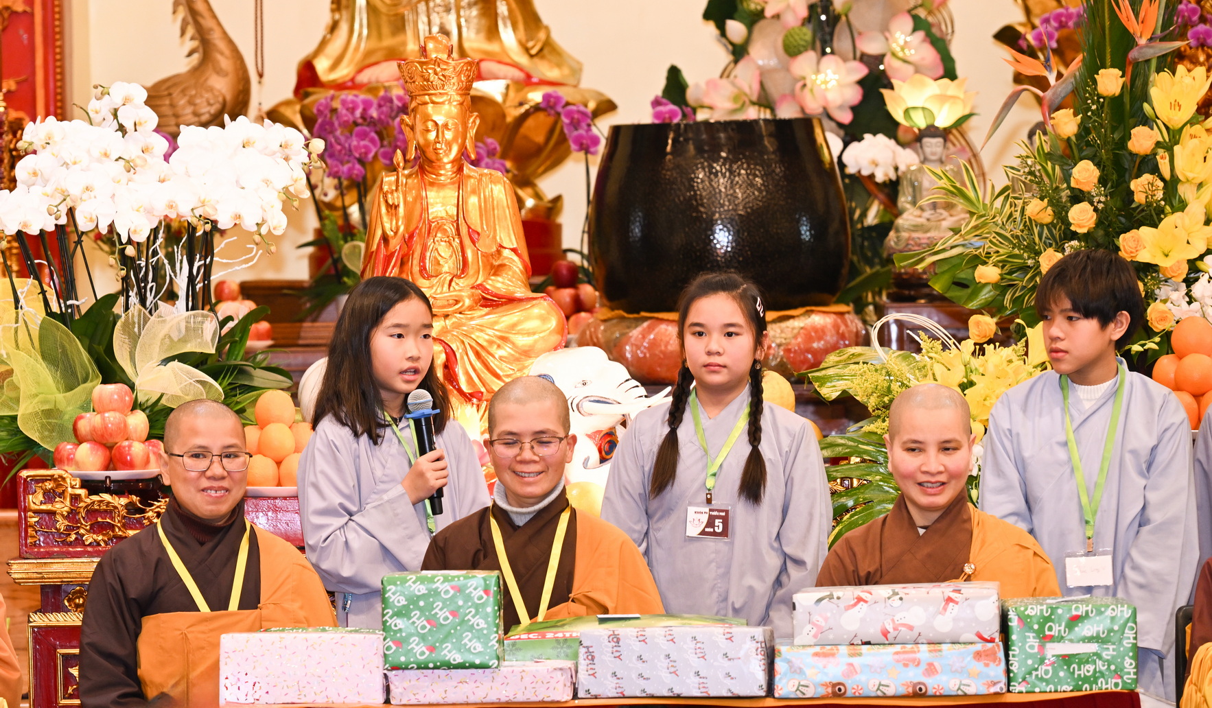 Chùa Đức Viên, San Jose, Hoa Kỳ. Khóa tu thiếu nhi mùa Đông 2025 – Ngày tu học thứ 4: 28/12/2025 Chú thích ảnh: 03-13 Sinh hoạt chung tại trai đường. Các anh chị hướng dẫn phát biểu cảm tưởng. 14-24 Sinh hoạt chung tại chánh điện. Lễ Phật, tụng kinh (tiếng Anh), lạy tứ ân. 25-37 Lễ bế mạc khóa tu tại chánh điện. Các em thiếu nhi đại diện từng nhóm phát biểu cảm tưởng (tiếng Việt, tiếng Anh) và nhận quà lưu niệm. 38-38 Lễ bế mạc khóa tu tại chánh điện. Sư cô Viên Trung Như phát biểu cảm tạ. 39-41 Lễ bế mạc khóa tu tại chánh điện. Ni sư Giám viện phát biểu. Hồi hướng. 42-42 Giờ ăn trưa 43-44 Đốt pháo 45-52 Múa lân 53-56 Biểu diễn võ thuật Vovinam 57-78 Chương trình văn nghệ của từng nhóm 79-80 Giờ ăn tối. Kết thúc khóa tu.