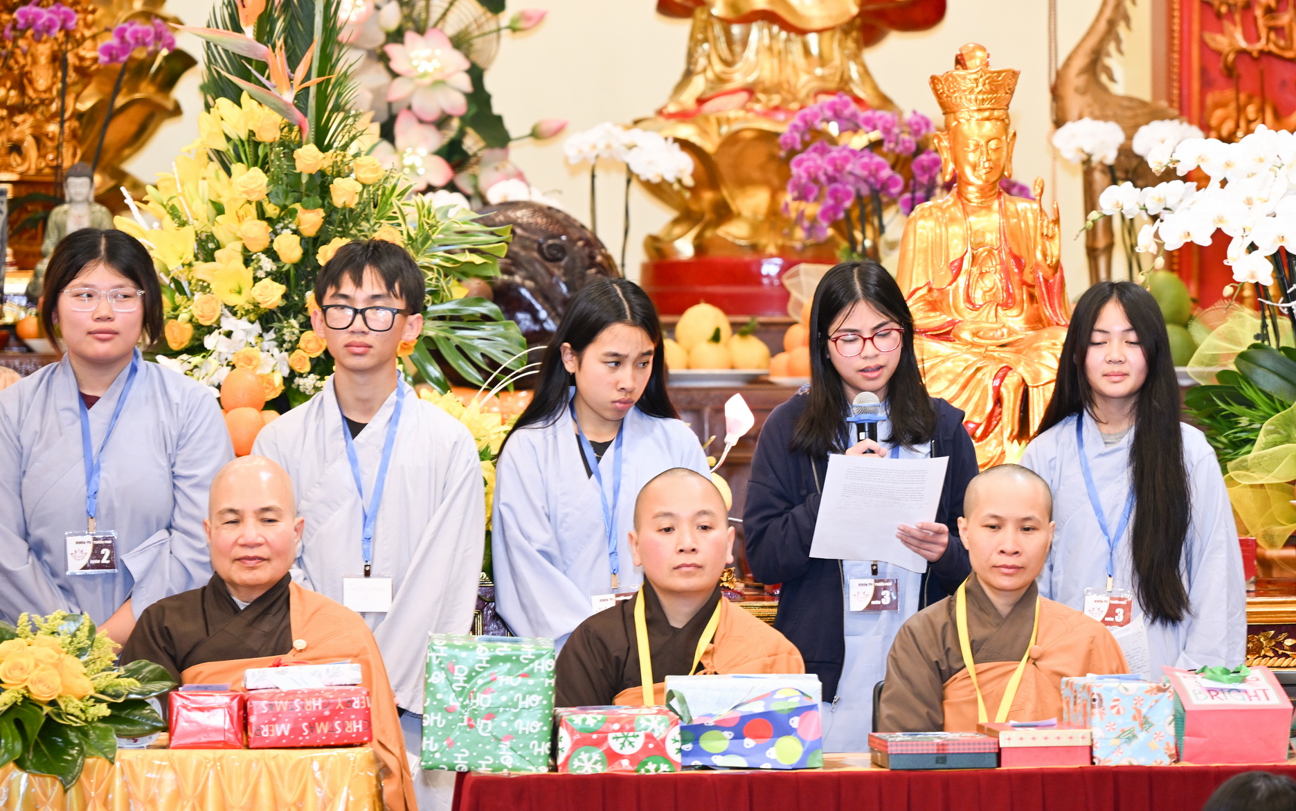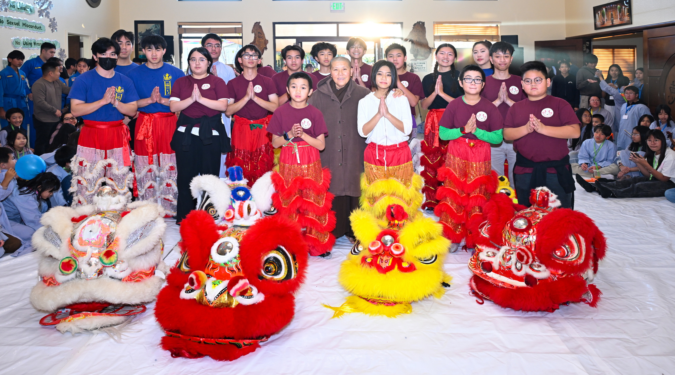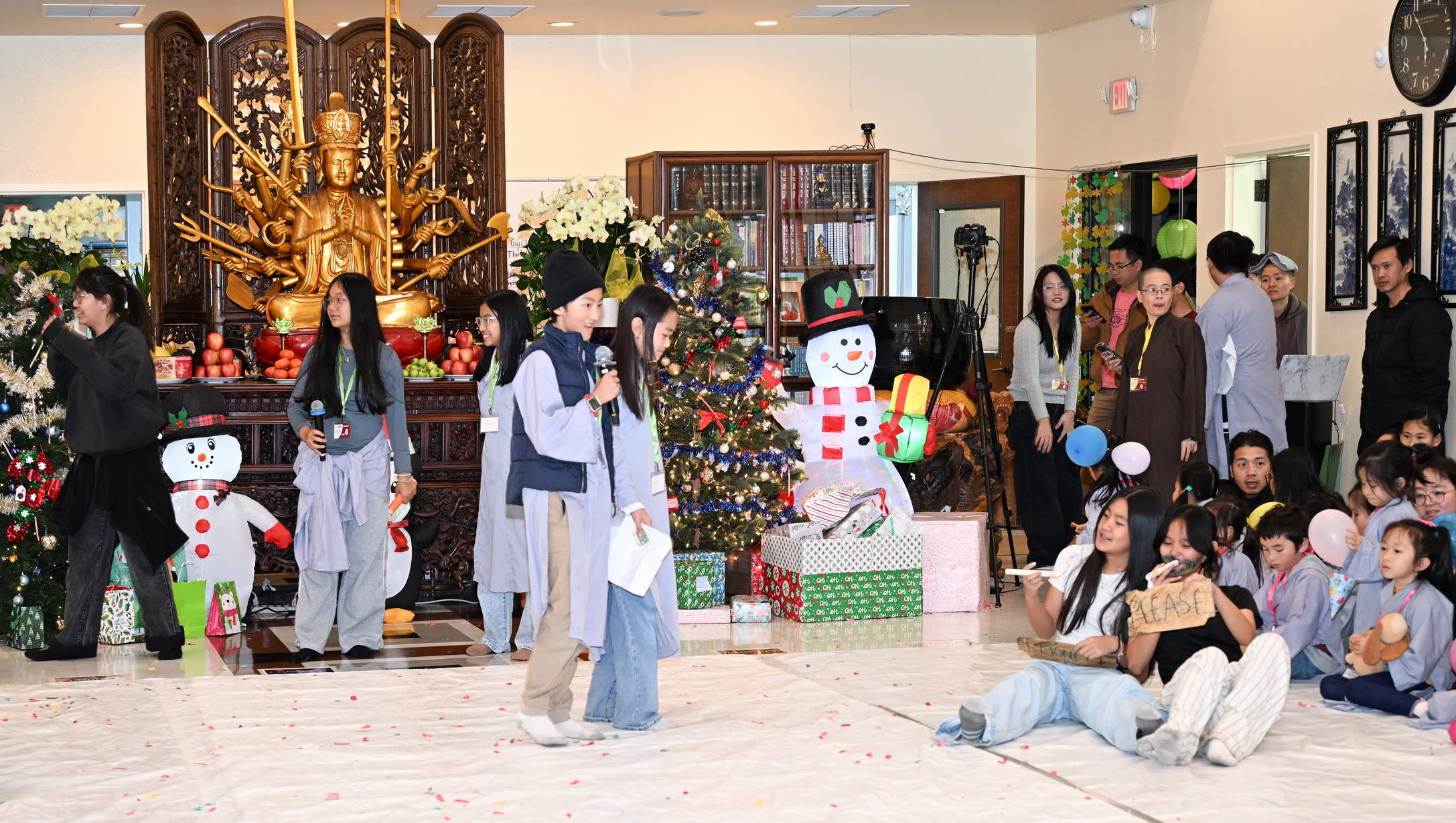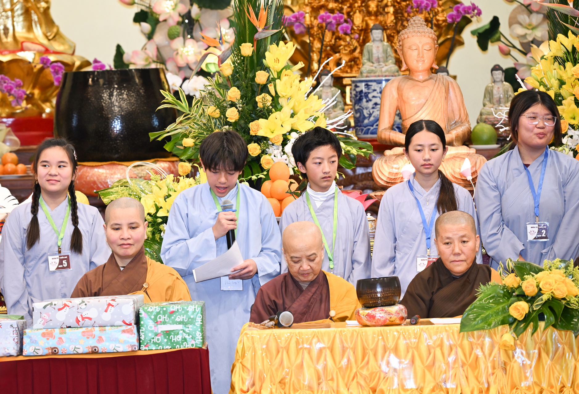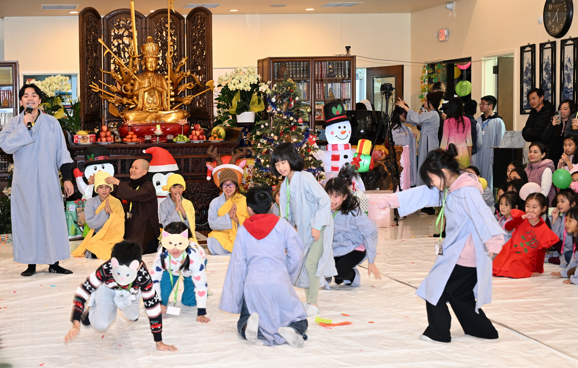 Chùa Đức Viên, San Jose, Hoa Kỳ. Khóa tu thiếu nhi mùa Đông 2025 – Ngày tu học thứ 4: 28/12/2025 Chú thích ảnh: 03-13 Sinh hoạt chung tại trai đường. Các anh chị hướng dẫn phát biểu cảm tưởng. 14-24 Sinh hoạt chung tại chánh điện. Lễ Phật, tụng kinh (tiếng Anh), lạy tứ ân. 25-37 Lễ bế mạc khóa tu tại chánh điện. Các em thiếu nhi đại diện từng nhóm phát biểu cảm tưởng (tiếng Việt, tiếng Anh) và nhận quà lưu niệm. 38-38 Lễ bế mạc khóa tu tại chánh điện. Sư cô Viên Trung Như phát biểu cảm tạ. 39-41 Lễ bế mạc khóa tu tại chánh điện. Ni sư Giám viện phát biểu. Hồi hướng. 42-42 Giờ ăn trưa 43-44 Đốt pháo 45-52 Múa lân 53-56 Biểu diễn võ thuật Vovinam 57-78 Chương trình văn nghệ của từng nhóm 79-80 Giờ ăn tối. Kết thúc khóa tu.