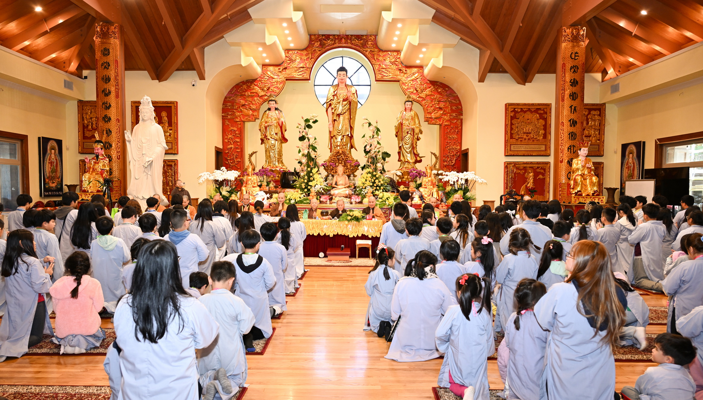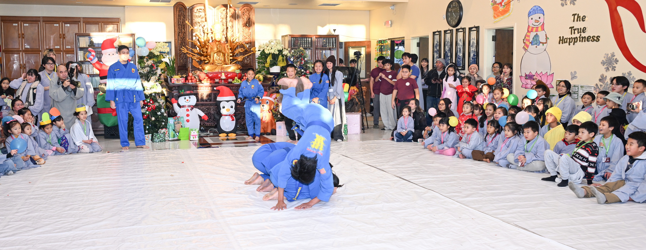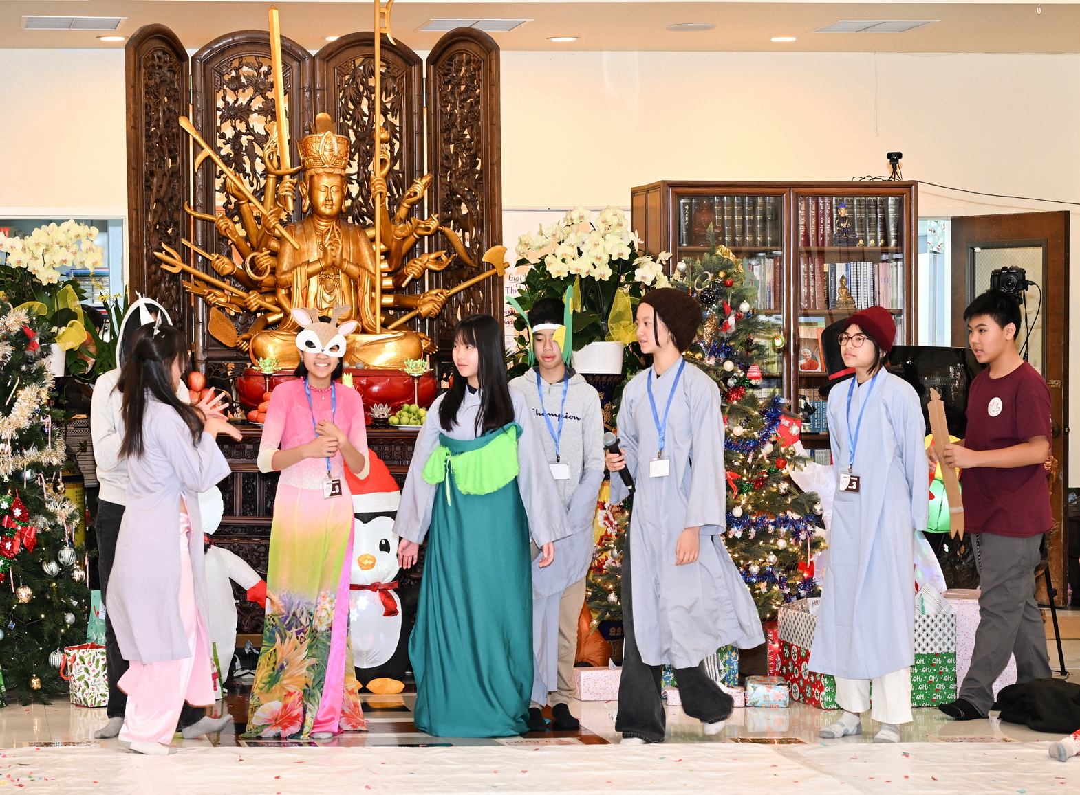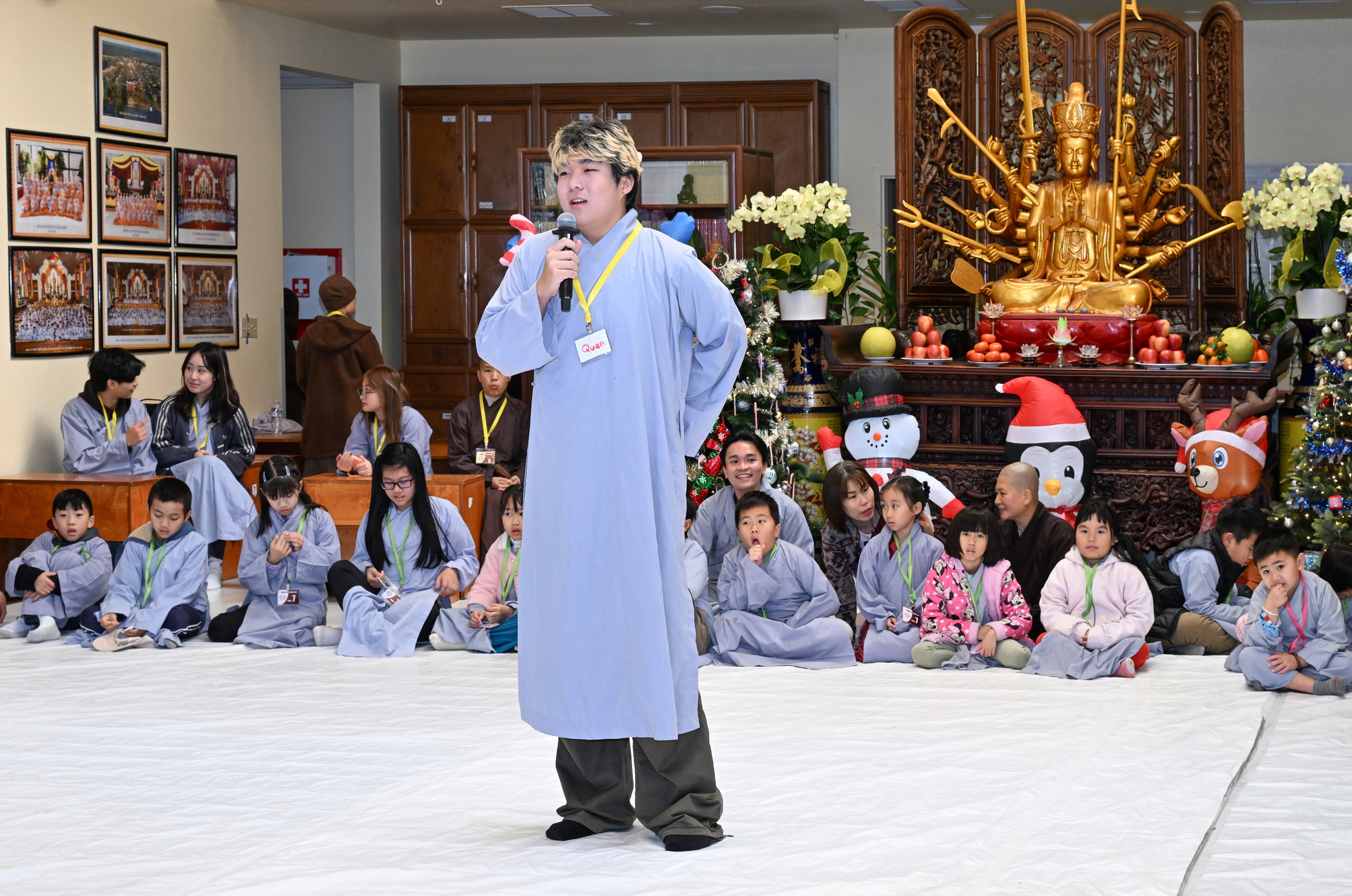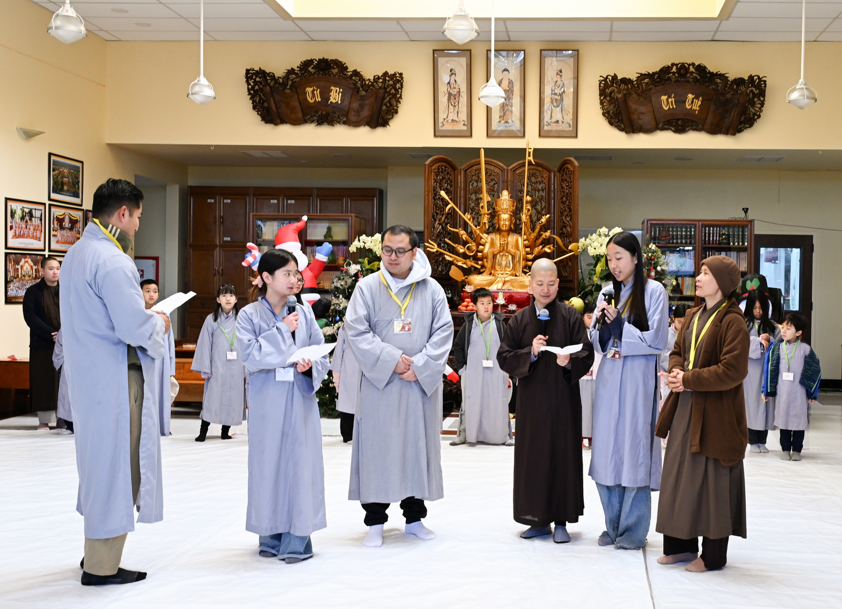 Chùa Đức Viên, San Jose, Hoa Kỳ. Khóa tu thiếu nhi mùa Đông 2025 – Ngày tu học thứ 4: 28/12/2025 Chú thích ảnh: 03-13 Sinh hoạt chung tại trai đường. Các anh chị hướng dẫn phát biểu cảm tưởng. 14-24 Sinh hoạt chung tại chánh điện. Lễ Phật, tụng kinh (tiếng Anh), lạy tứ ân. 25-37 Lễ bế mạc khóa tu tại chánh điện. Các em thiếu nhi đại diện từng nhóm phát biểu cảm tưởng (tiếng Việt, tiếng Anh) và nhận quà lưu niệm. 38-38 Lễ bế mạc khóa tu tại chánh điện. Sư cô Viên Trung Như phát biểu cảm tạ. 39-41 Lễ bế mạc khóa tu tại chánh điện. Ni sư Giám viện phát biểu. Hồi hướng. 42-42 Giờ ăn trưa 43-44 Đốt pháo 45-52 Múa lân 53-56 Biểu diễn võ thuật Vovinam 57-78 Chương trình văn nghệ của từng nhóm 79-80 Giờ ăn tối. Kết thúc khóa tu.