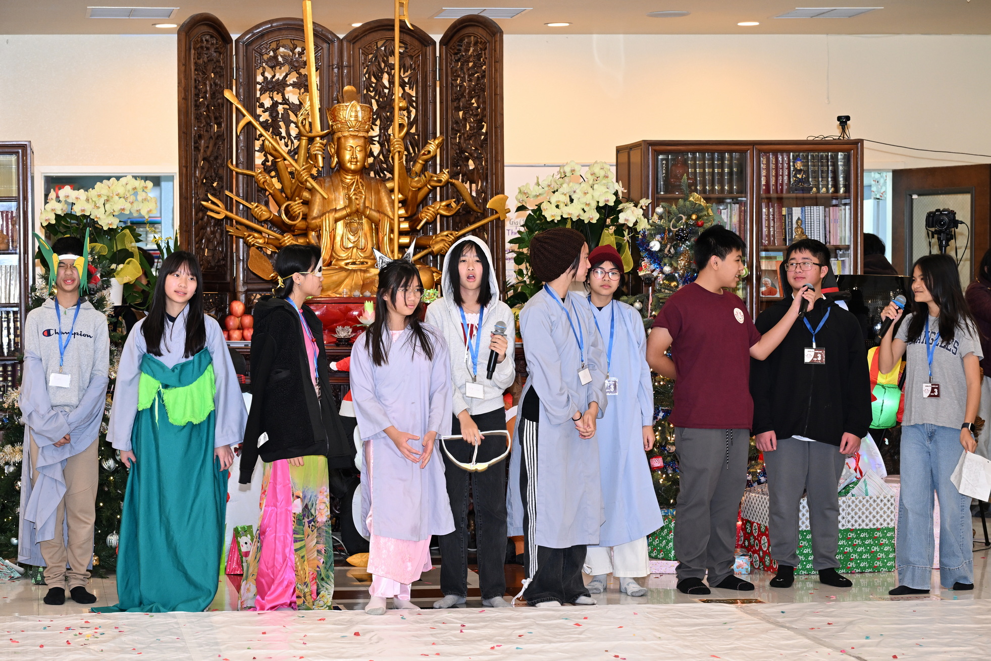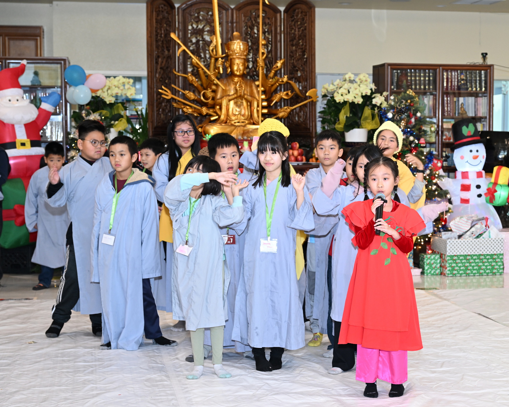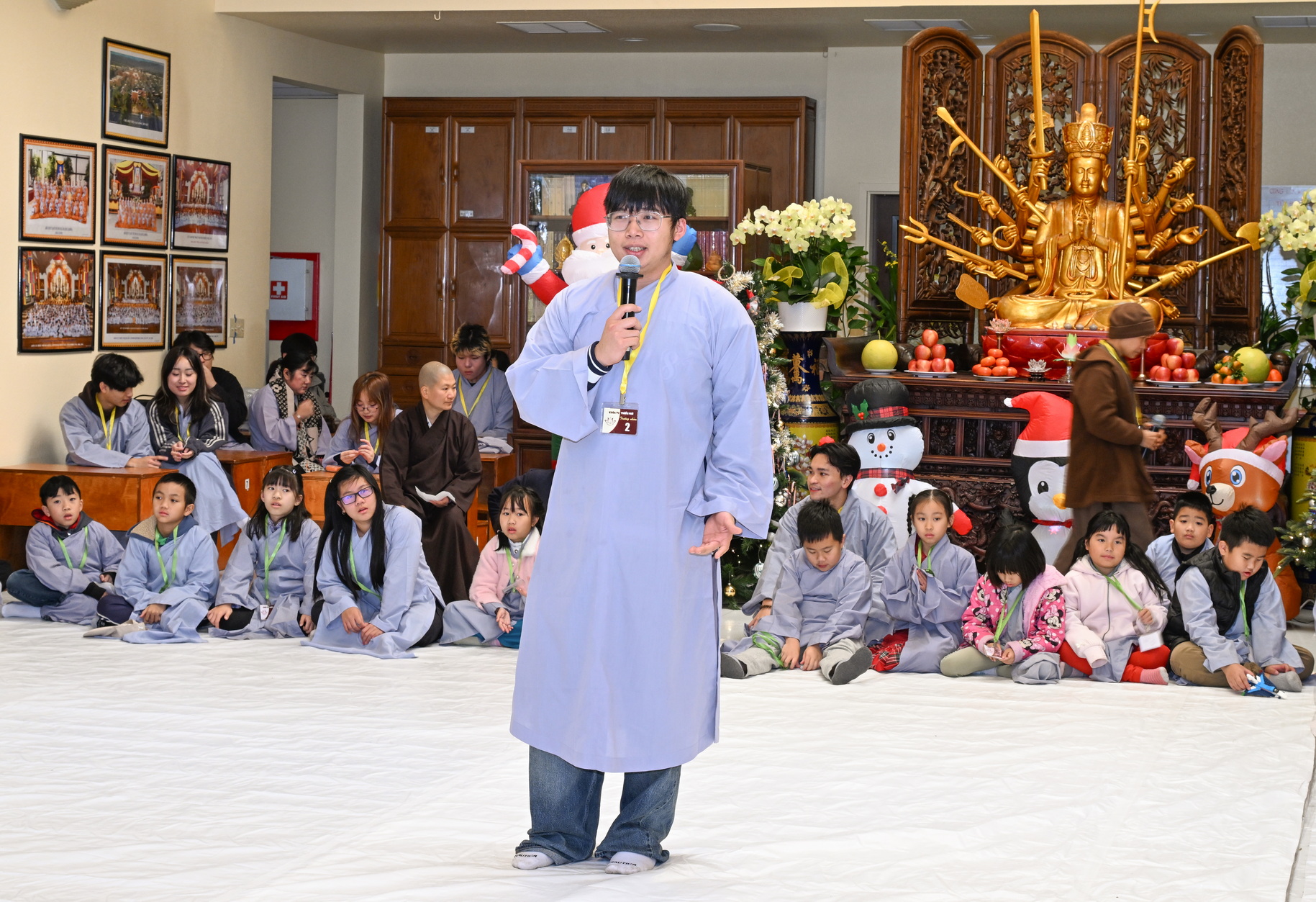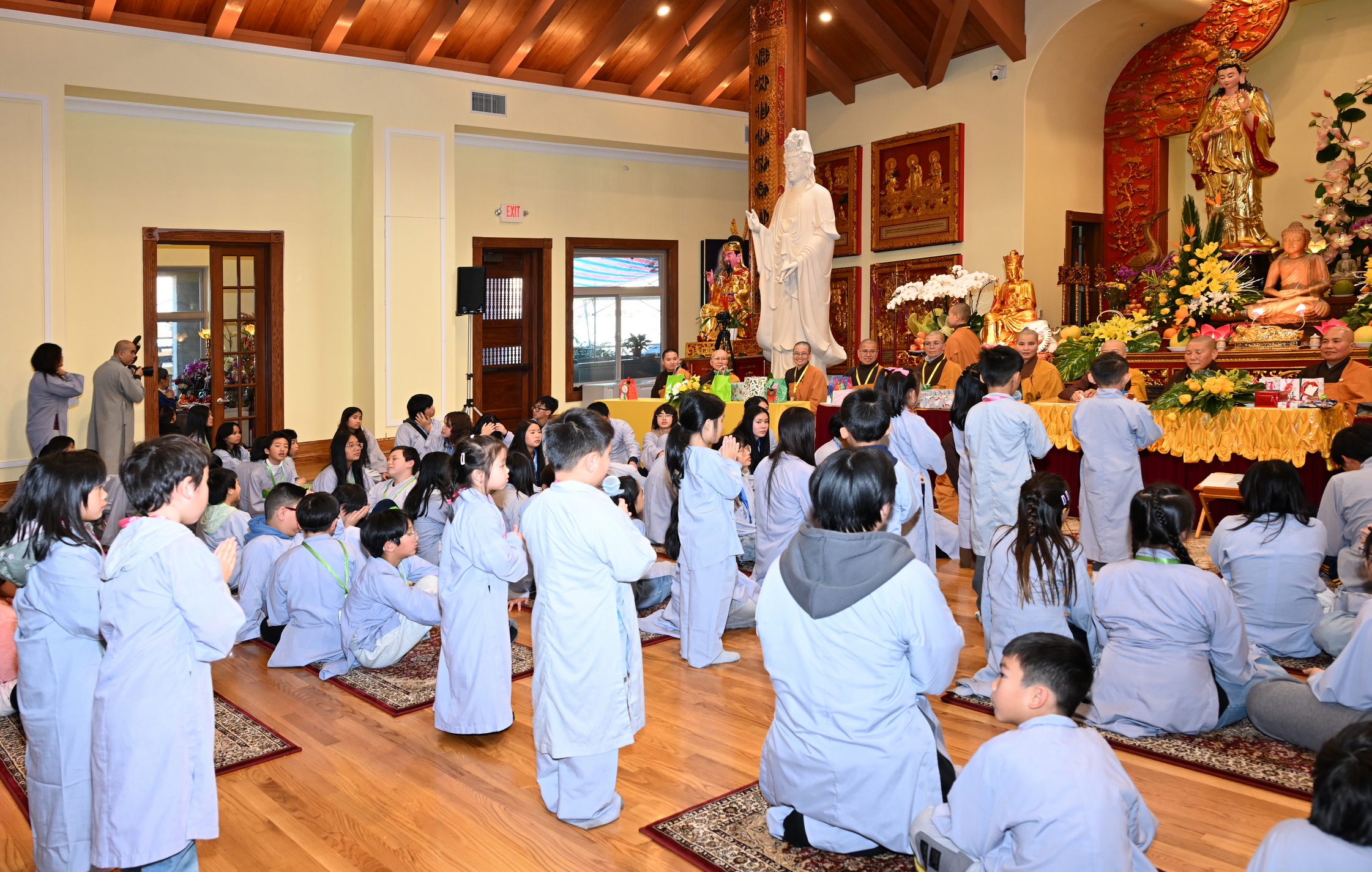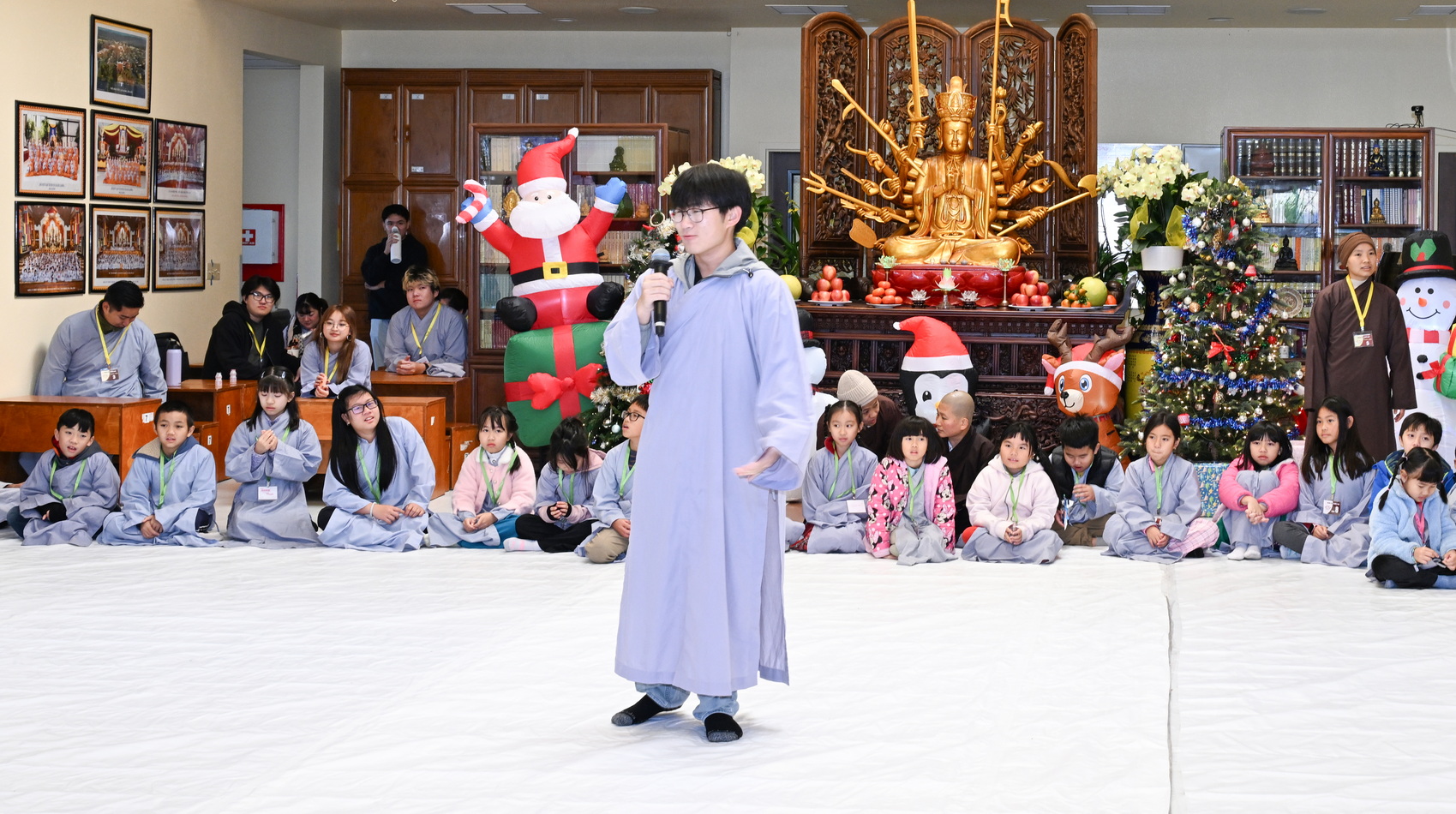 Chùa Đức Viên, San Jose, Hoa Kỳ. Khóa tu thiếu nhi mùa Đông 2025 – Ngày tu học thứ 4: 28/12/2025 Chú thích ảnh: 03-13 Sinh hoạt chung tại trai đường. Các anh chị hướng dẫn phát biểu cảm tưởng. 14-24 Sinh hoạt chung tại chánh điện. Lễ Phật, tụng kinh (tiếng Anh), lạy tứ ân. 25-37 Lễ bế mạc khóa tu tại chánh điện. Các em thiếu nhi đại diện từng nhóm phát biểu cảm tưởng (tiếng Việt, tiếng Anh) và nhận quà lưu niệm. 38-38 Lễ bế mạc khóa tu tại chánh điện. Sư cô Viên Trung Như phát biểu cảm tạ. 39-41 Lễ bế mạc khóa tu tại chánh điện. Ni sư Giám viện phát biểu. Hồi hướng. 42-42 Giờ ăn trưa 43-44 Đốt pháo 45-52 Múa lân 53-56 Biểu diễn võ thuật Vovinam 57-78 Chương trình văn nghệ của từng nhóm 79-80 Giờ ăn tối. Kết thúc khóa tu.