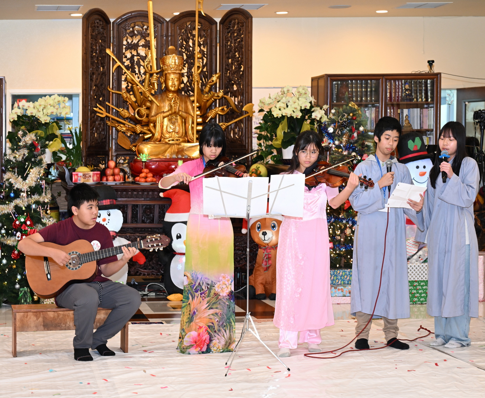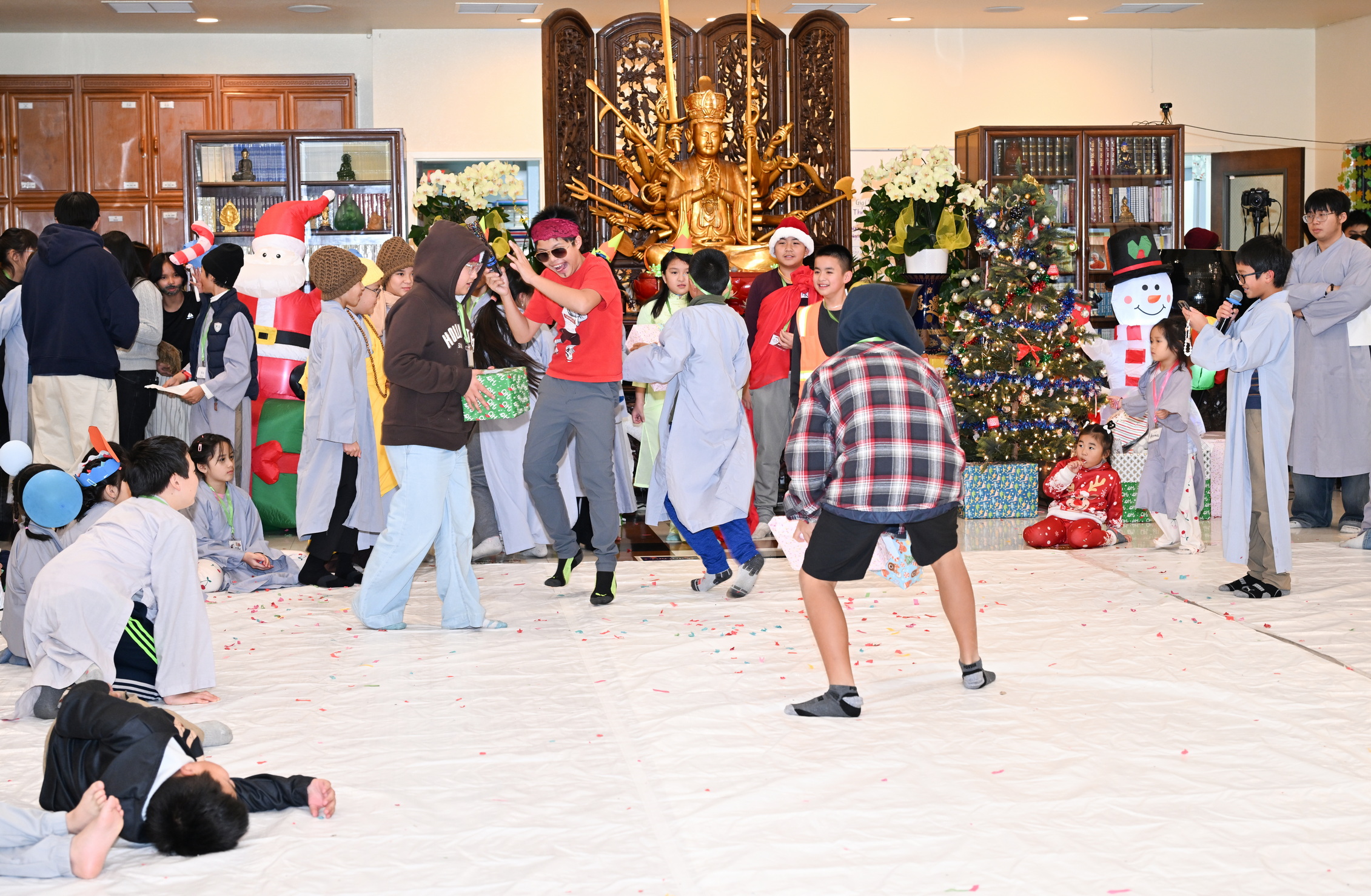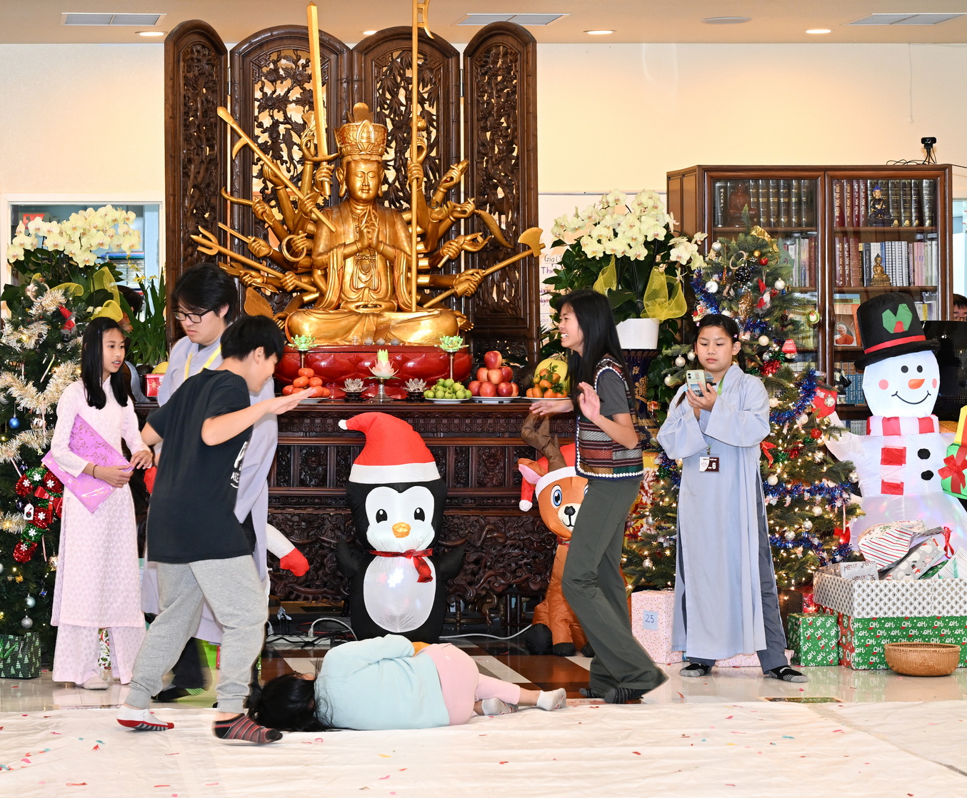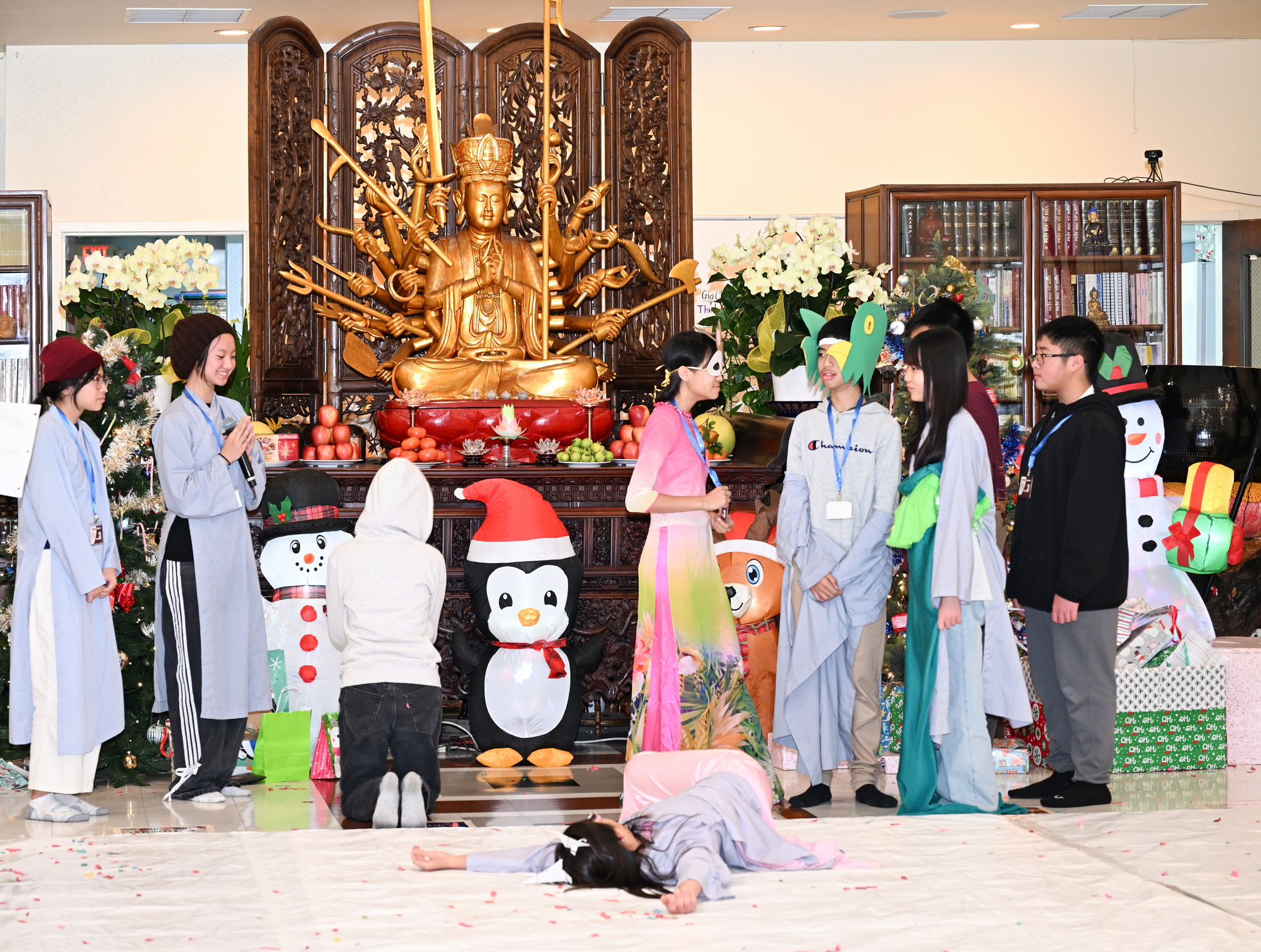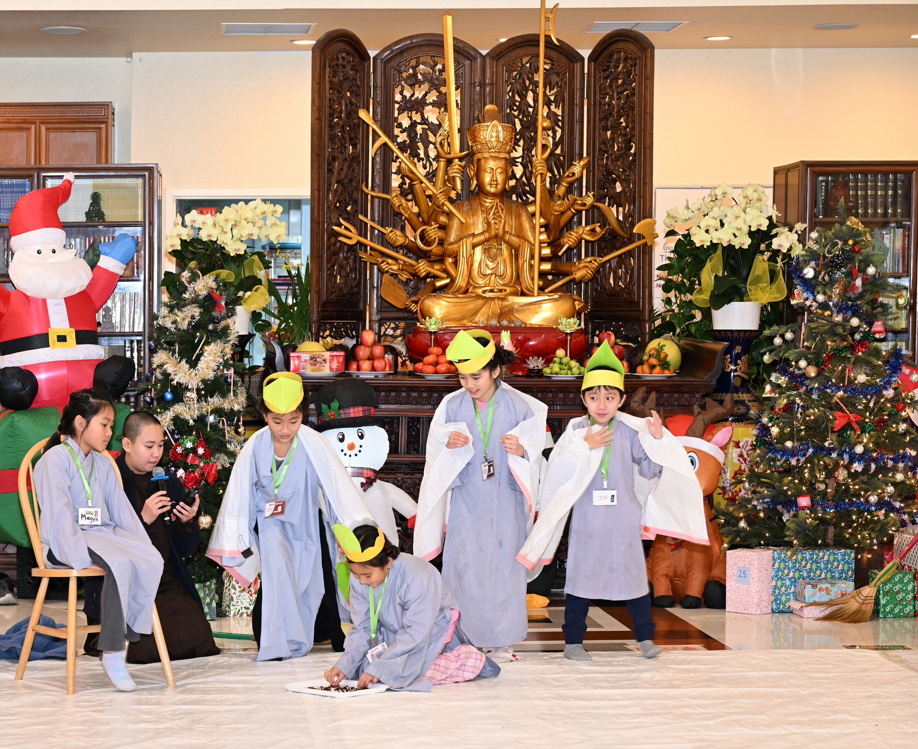 Chùa Đức Viên, San Jose, Hoa Kỳ. Khóa tu thiếu nhi mùa Đông 2025 – Ngày tu học thứ 4: 28/12/2025 Chú thích ảnh: 03-13 Sinh hoạt chung tại trai đường. Các anh chị hướng dẫn phát biểu cảm tưởng. 14-24 Sinh hoạt chung tại chánh điện. Lễ Phật, tụng kinh (tiếng Anh), lạy tứ ân. 25-37 Lễ bế mạc khóa tu tại chánh điện. Các em thiếu nhi đại diện từng nhóm phát biểu cảm tưởng (tiếng Việt, tiếng Anh) và nhận quà lưu niệm. 38-38 Lễ bế mạc khóa tu tại chánh điện. Sư cô Viên Trung Như phát biểu cảm tạ. 39-41 Lễ bế mạc khóa tu tại chánh điện. Ni sư Giám viện phát biểu. Hồi hướng. 42-42 Giờ ăn trưa 43-44 Đốt pháo 45-52 Múa lân 53-56 Biểu diễn võ thuật Vovinam 57-78 Chương trình văn nghệ của từng nhóm 79-80 Giờ ăn tối. Kết thúc khóa tu.