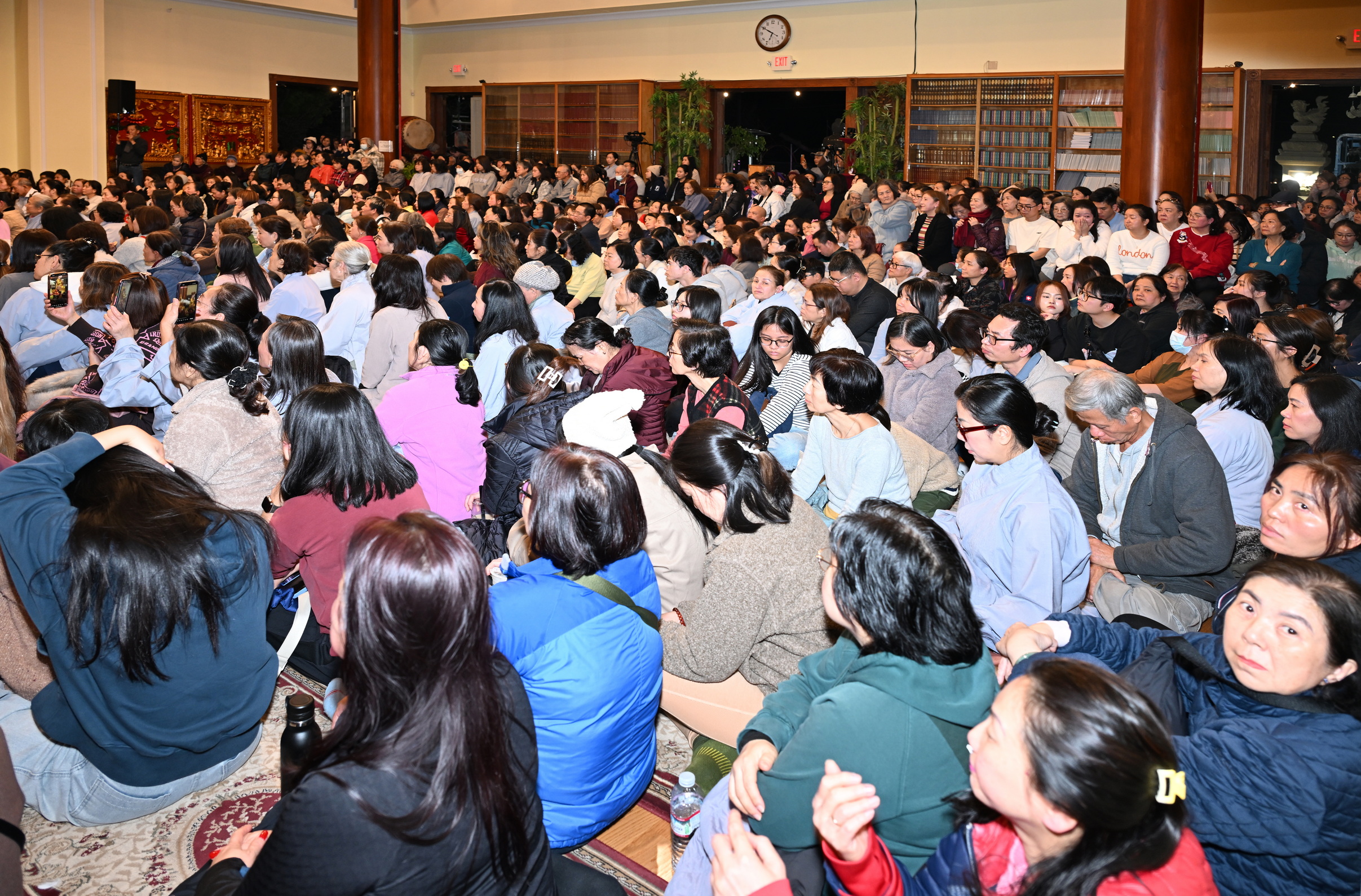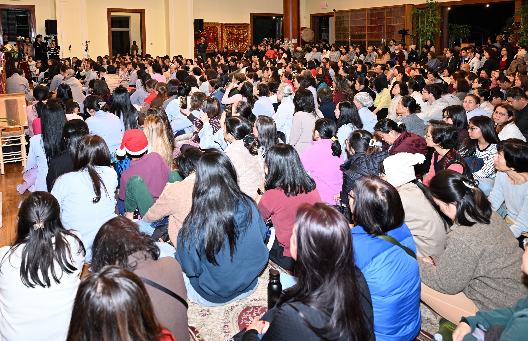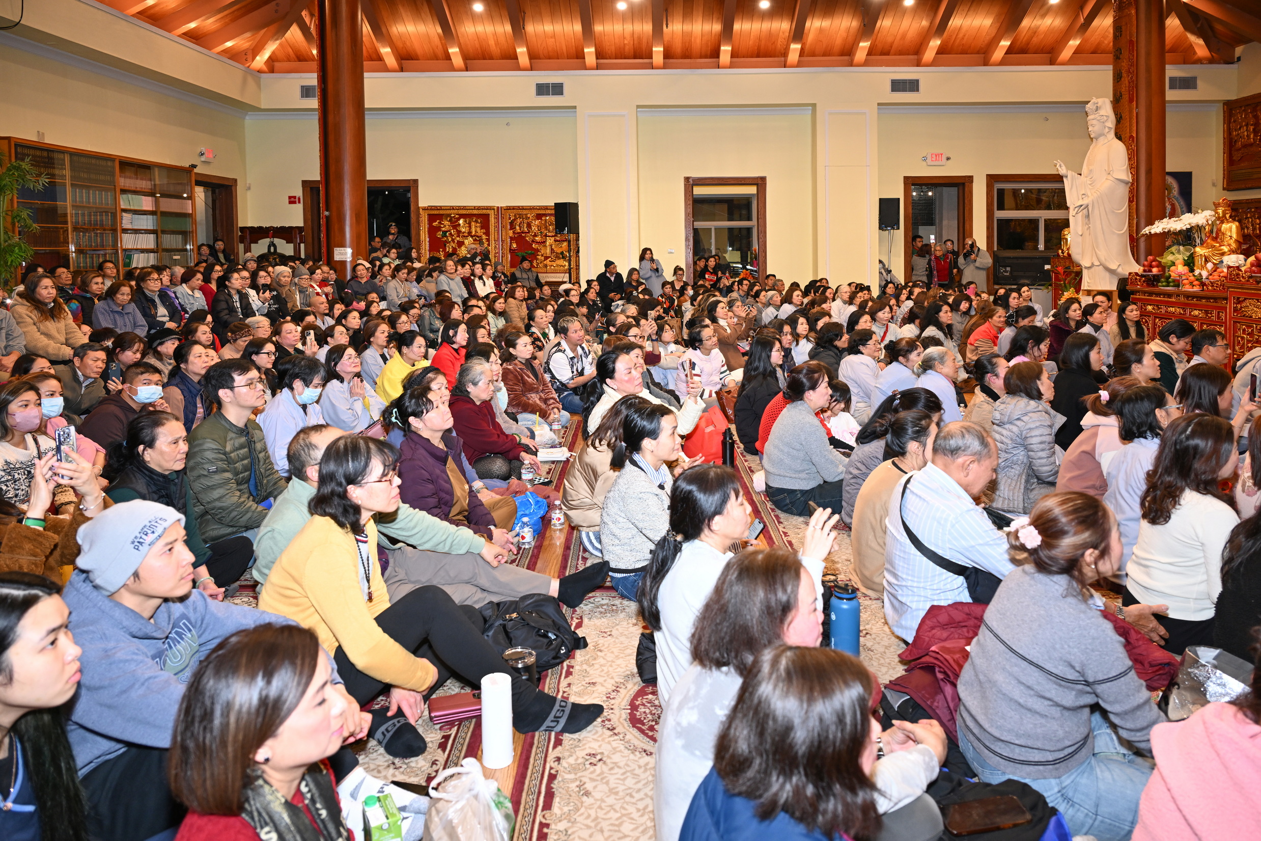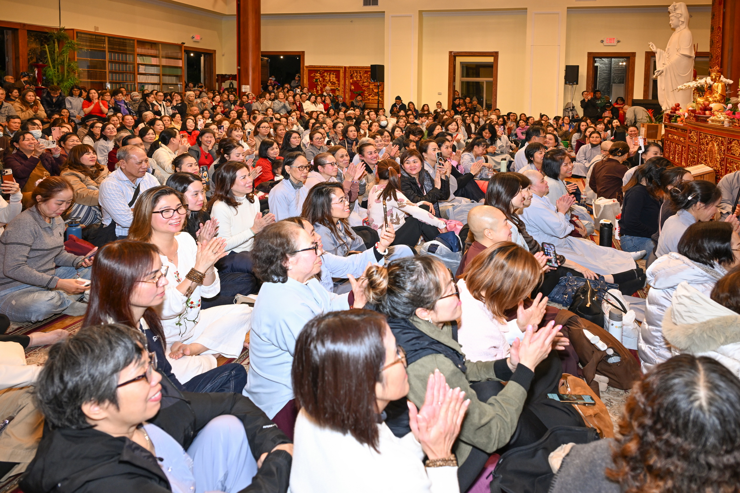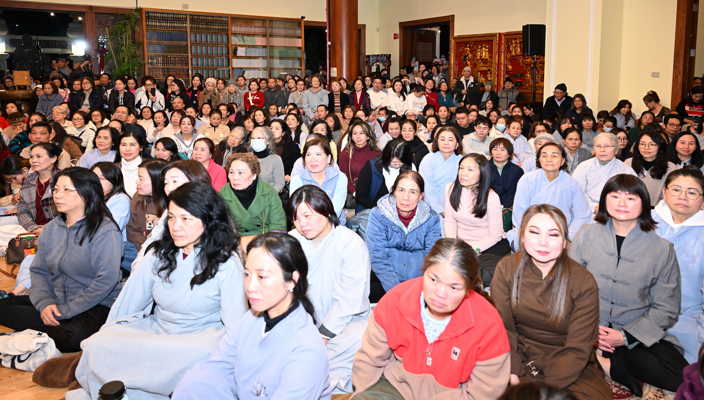 Số lượng thính chúng gần cả ngàn người, ngồi chật kín trong chánh điện, sân trước, hành lang, sân sau, vườn chùa … Nhiều Phật tử cao niên đã đến chùa từ trưa; vất vả tìm chỗ đậu xe (parking) khá xa chùa để vào được bên trong chánh điện.